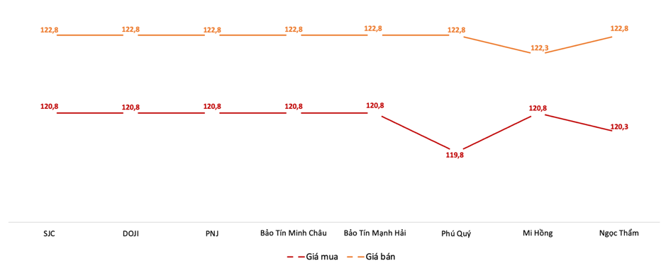 Nhiều thương hiệu lớn khác như PNJ, DOJI, Bảo Tín Minh Châu và Bảo Tín Mạnh Hải đều niêm yết giá vàng miếng bám sát giá công ty SJC, giao dịch mua, bán tại 120,8 triệu đồng – 122,8 triệu đồng mỗi lượng.