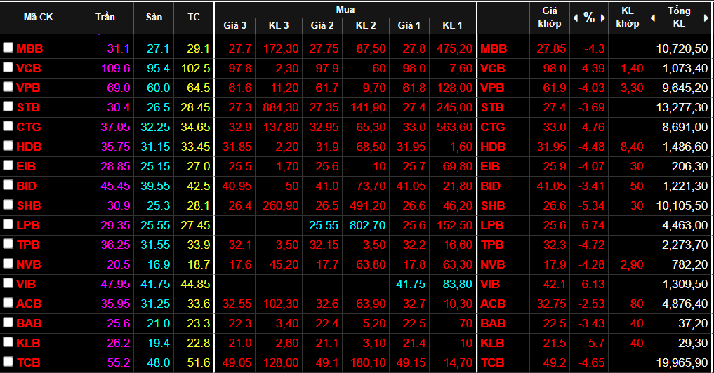 Hàng loạt cổ phiếu ngân hàng – những mã được bắt đáy cực lớn tuần trước – sáng nay thủng đáy ngắn hạn. TCB lao dốc 4,65% xuống 49.200 đồng trong khi đáy thấp nhất tuần trước là 50.600 đồng – cũng là ngày T 3 hàng về tài khoản sáng nay. CTG giảm 4,76% xuống 33.000 đồng và giá T3 thấp nhất tuần trước là 33.700 đồng. HDB, MBB, VCB, BID, TPB đều trong tình cảnh như vậy.