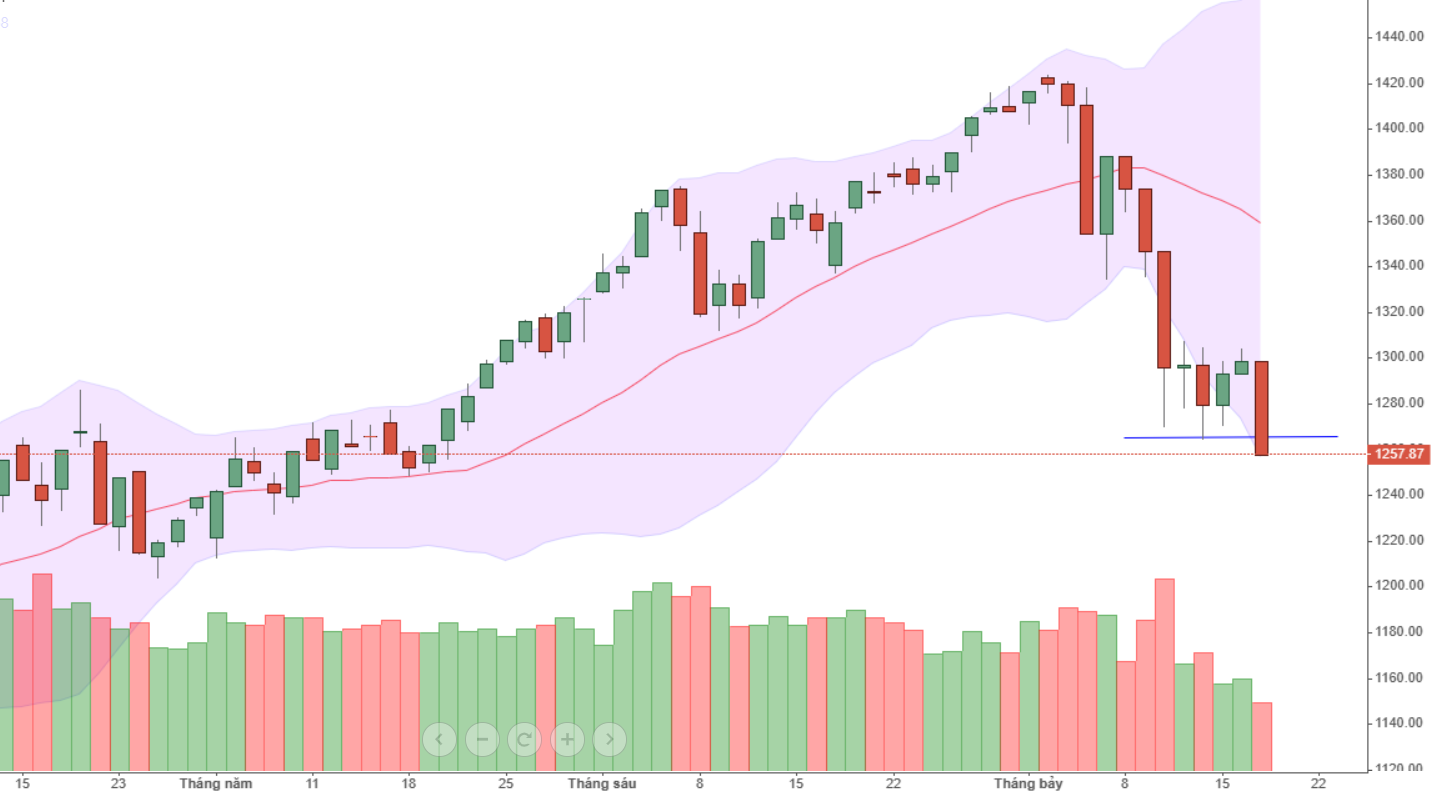Thị trường hôm nay phản ứng với thông tin giãn cách xã hội 19 tỉnh khá mạnh. VN-Index sụt giảm 3,19% tương đương 41,44 điểm. Độ rộng sàn HoSE là 57 mã tăng/322 mã giảm, trong đó 35 mã giảm sàn. Khoảng 200 mã đang giảm trên 2% giá trị.