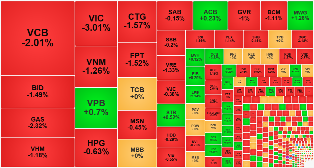 VN-Index hiện đang có 167 cổ phiếu giảm giá trên 1% và thanh khoản nhóm này chiếm 53,1% tổng giá trị khớp của sàn. Tuy thanh khoản HoSE đã giảm 13% so với sáng hôm qua, chỉ đạt khoảng 5.507 tỷ đồng. VN30 thậm chí giao dịch 1.970 tỷ, giảm 26%.