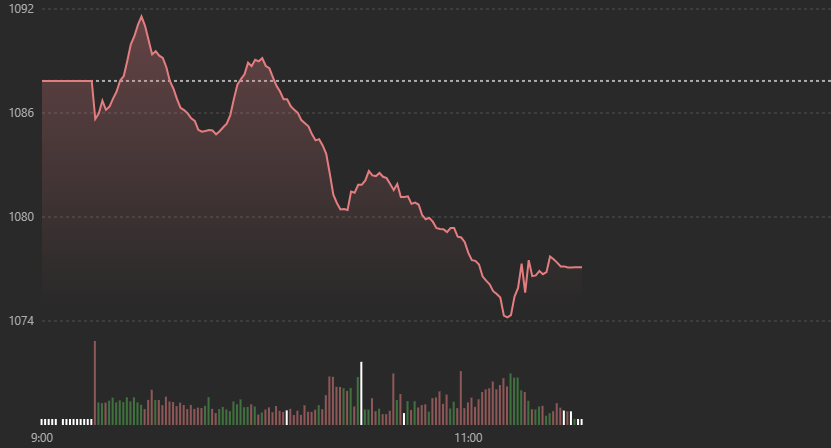 Phần lớn mức giảm 10,75 điểm của chỉ số xuất hiện trong nửa sau của phiên sáng. Ban đầu giao dịch chậm nhưng thị trường trong thế giằng co. VN-Index đạt đỉnh thứ nhất lúc 9h30, tăng gần 4 điểm, độ rộng ghi nhận 195 mã tăng/149 mã giảm. Đỉnh thứ hai lúc 10h tăng nhẹ hơn 1 điểm, độ rộng còn 174 mã tăng/211 mã giảm. Đến cuối phiên HoSE chỉ còn 93 mã tăng/364 mã giảm.