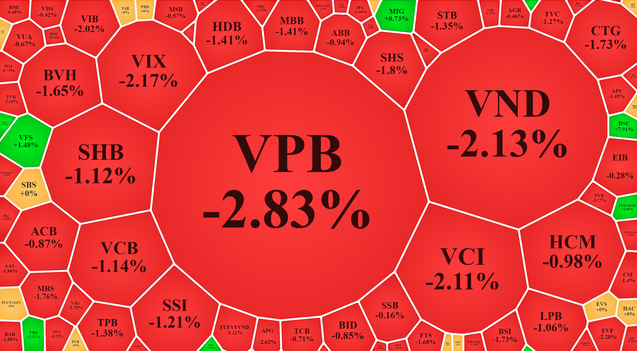 Nhóm cổ phiếu tài chính đang yếu nhất, với chỉ số VNFIN trên HoSE giảm 1,3%. SGB, VBB là 2/27 mã ngân hàng còn tăng. Nhóm VPB, VIB giảm trên 2%, CTG, HDB, MBB, TPB, SHB, VCB, LPB giảm trên 1%. Cổ phiếu chứng khoán cũng chỉ có 4 mã tăng là DSC, TCI, VFS, WSS, trong khi số giảm gấp 5 lần. Các blue-chips lớn nhóm này giảm sâu: SSI giảm 1,21%, HCM giảm 0,98%, VND giảm 2,13%, VCI giảm 2,11%...