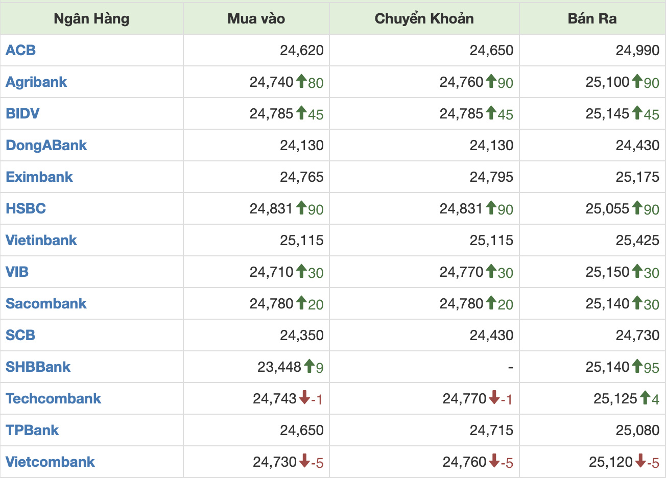 Nhiều ngân hàng thương mại tăng mạnh giá bán USD như SHB tăng 9 đồng ở chiều mua vào nhưng tăng tới 95 đồng chiều bán ra. Agribank, HSBC tăng mạnh 90 đồng ở cả 2 chiều mua - bán.