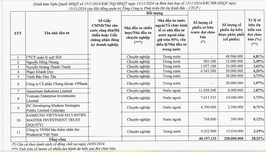 Trước đó, KBC đã công bố danh sách 11 nhà đầu tư tham gia đợt chào bán, trong đó: CTCP Quản lý Quỹ SGI (dự kiến mua 48,97 triệu cổ phiếu); Phạm Khánh Duy (39 triệu cổ phiếu); Trình Bảo Duy Tân (38 triệu cổ phiếu); Nguyễn Hồng Nhung và Nguyễn Hoàng Thanh Thanh (mỗi người 35 triệu cổ phiếu); CTCP Chứng khoán VPBank (20 triệu cổ phiếu); Công ty TNHH Bảo hiểm nhân thọ Prudential Việt Nam (13 triệu cổ phiếu); Vietnam Enterprise Investments Limited (10 triệu cổ phiếu); Amersham Industries Limited (8 triệu cổ phiếu); DC Developing Markets Strategies Plublic Limited Company (2,5 triệu cổ phiếu); Samsung Vietnam Securites Master Investment Trust (Equity) (500.000 cổ phiếu).