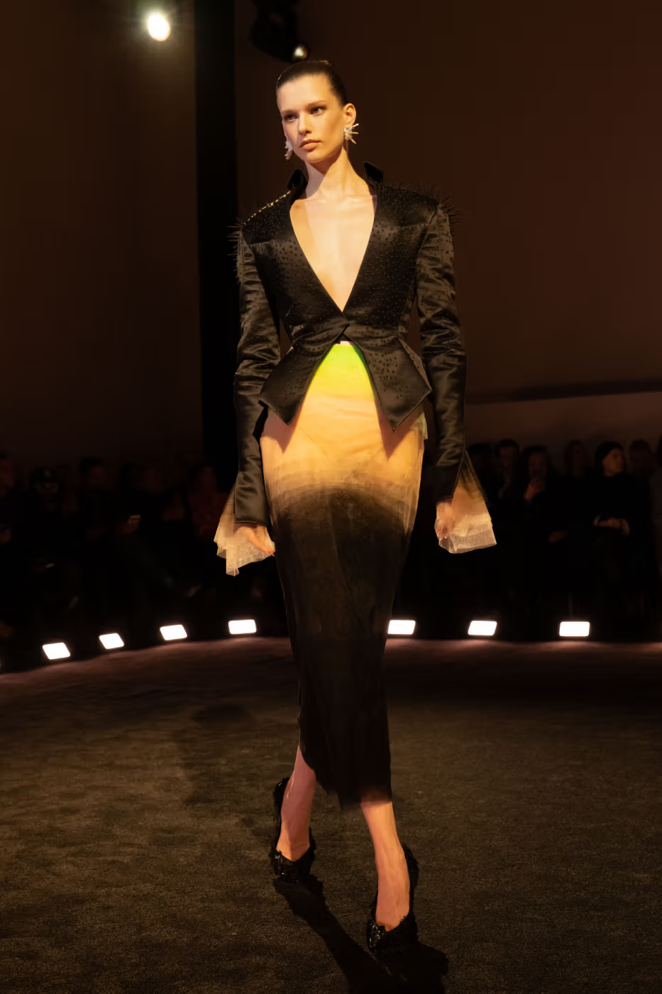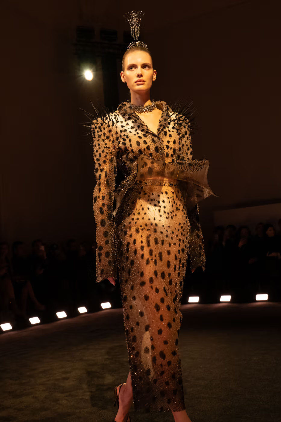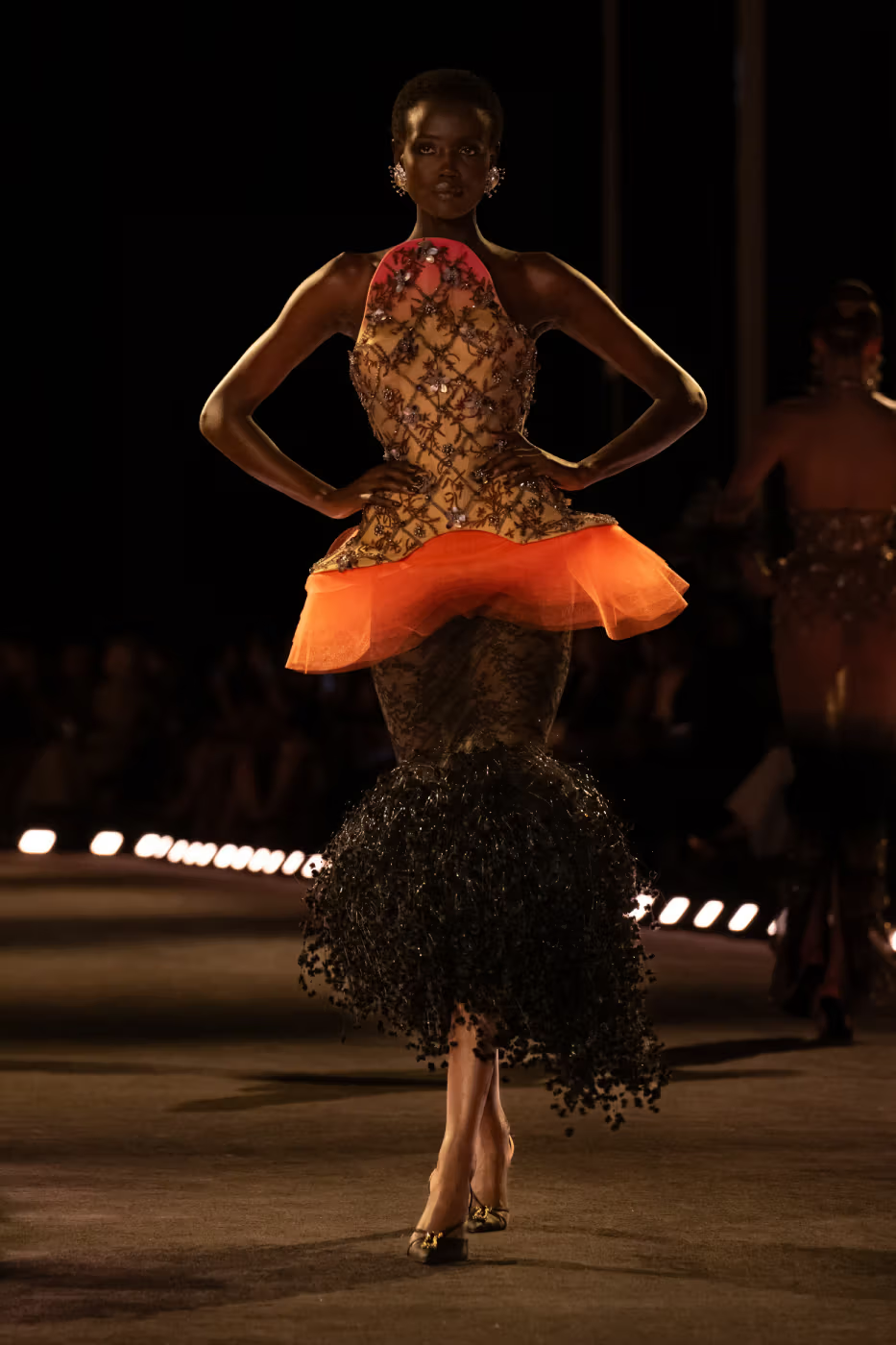 Ngay sau phần thảm đỏ, show thời trang diễn ra như là một tuyên ngôn nghệ thuật, đặt haute couture ở giao điểm giữa cảm xúc, lịch sử và hình tượng siêu thực. Roseberry khai thác tối đa tài năng thủ công couture để tạo ra trang phục vừa đẹp vừa chói chang, vừa quyến rũ vừa khiêu khích. Bộ sưu tập ghi dấu bước chuyển trọng tâm của thời trang cao cấp: từ “nhìn” sang cảm nhận.