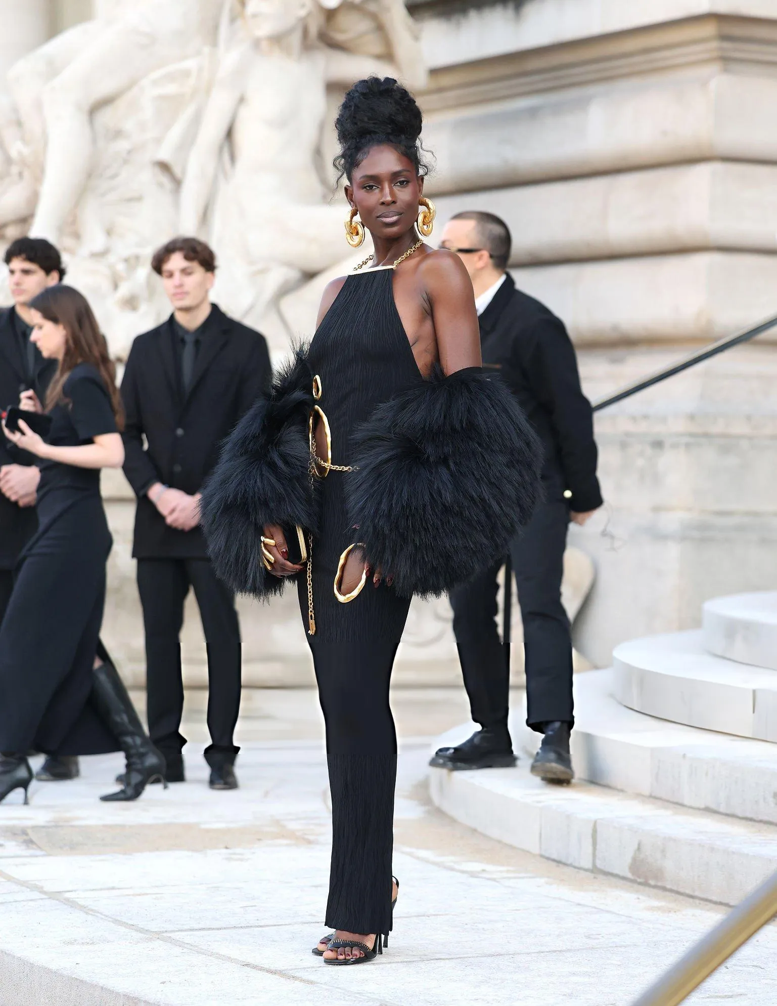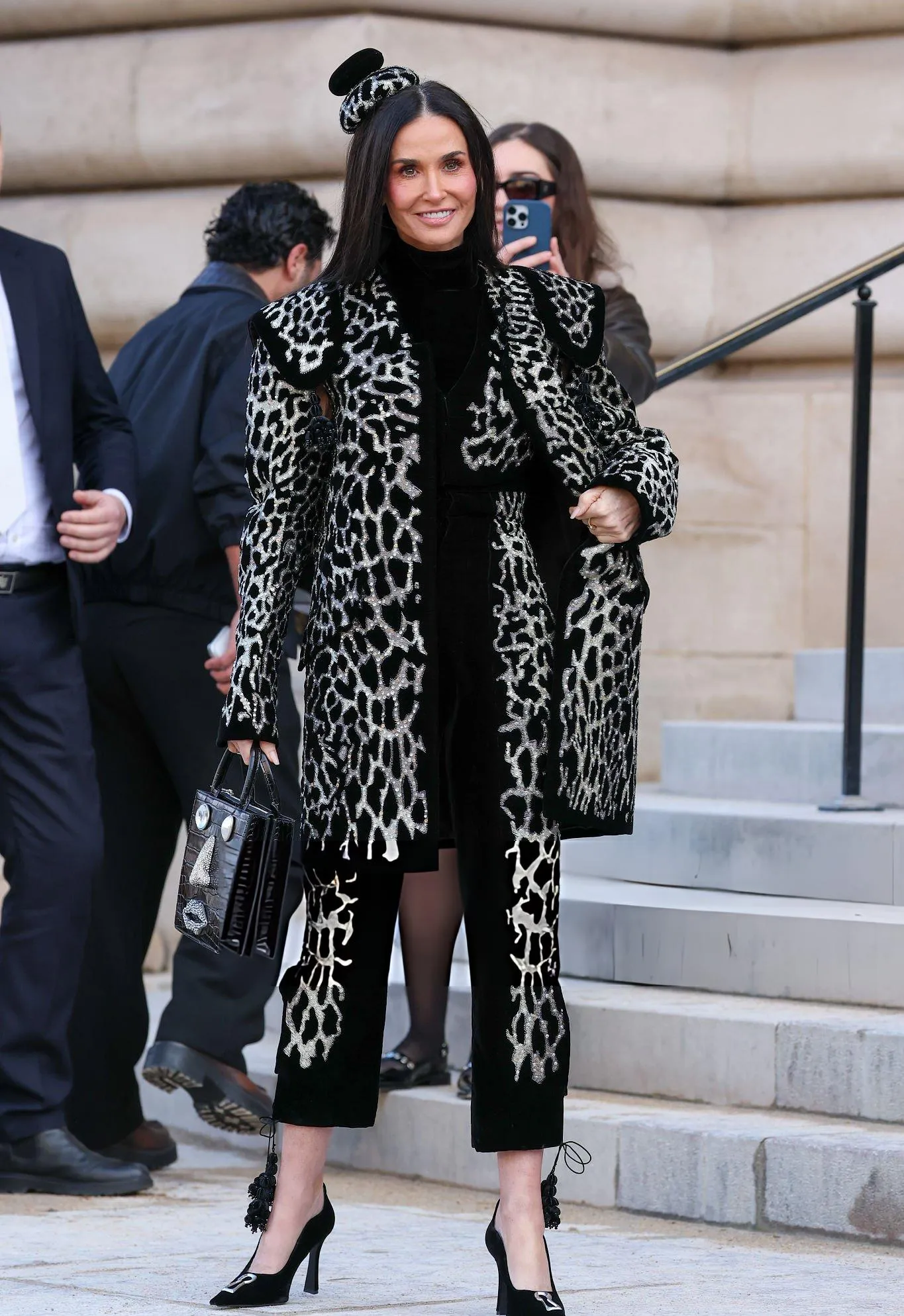 Mặt khác, Demi Moore góp mặt trong set đồ đồng bộ họa tiết da báo, trong khi Jodie Turner-Smith diện chiếc váy đen với những đường cắt xẻ viền vàng, thuộc bộ sưu tập Xuân 2026 của Schiaparelli.