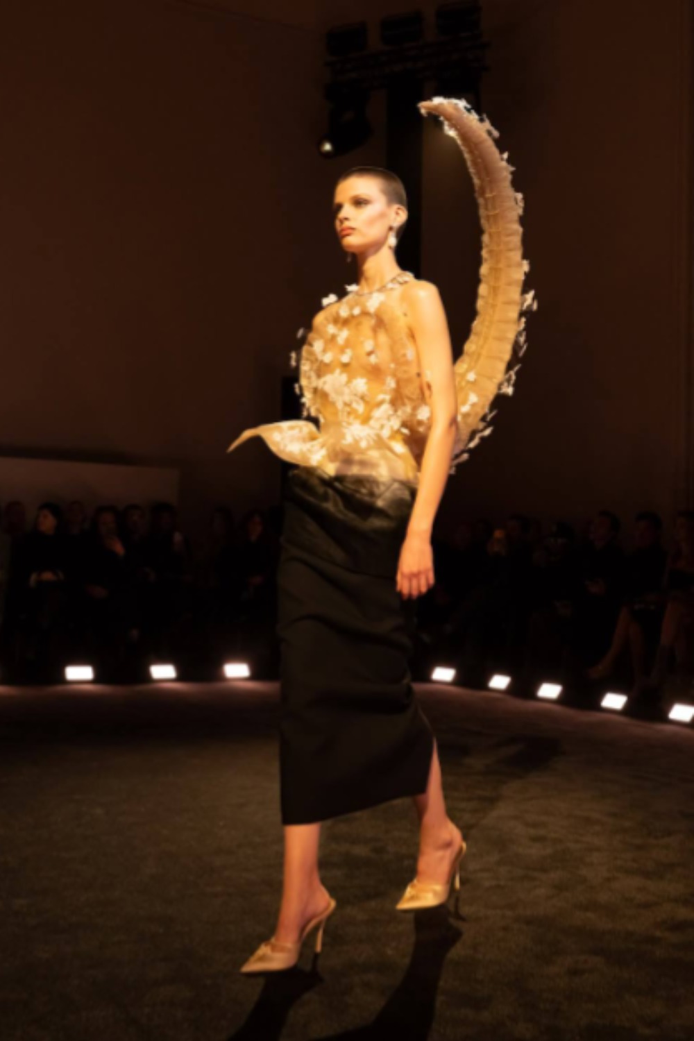 Trình độ thủ công của các nghệ nhân Schiaparelli tiếp tục là điều không cần bàn cãi. Hoa đắp nổi bung nở trên váy và áo khoác như đang sống, như thể chúng không được thêu lên mà tự mọc ra từ vải. Chim ruồi trở thành motif trung tâm, xuất hiện ở cả mở màn lẫn kết show: những chiếc áo với móng vuốt nhô ra từ ngực, đôi cánh vươn cao ở cổ áo, kết hợp cùng quần dáng thanh mảnh để giữ sự kỷ luật cho tổng thể phom dáng. Đó là sự cân bằng tinh tế giữa kịch tính và kiểm soát, một đặc trưng của haute couture đương đại.