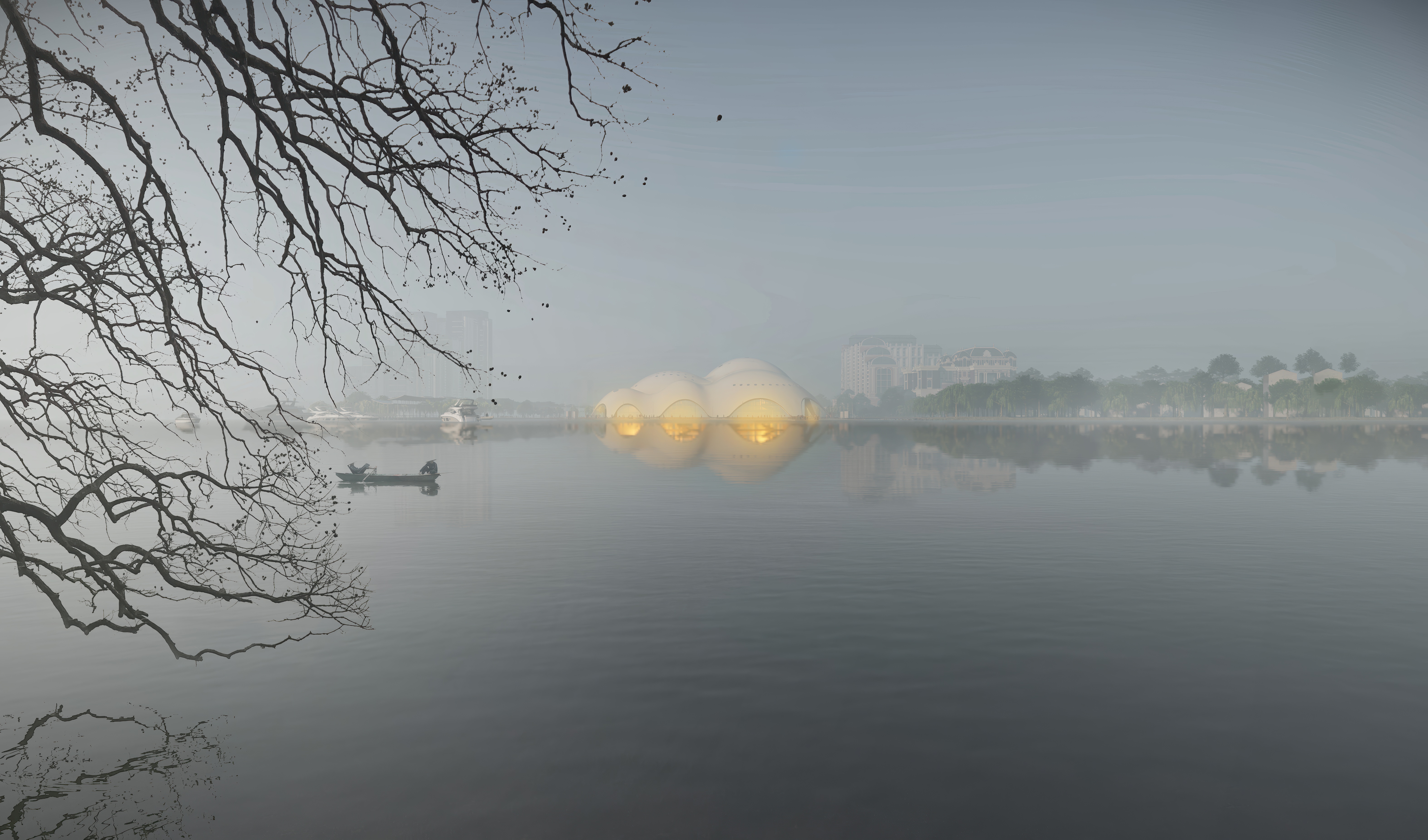 Dấu ấn đặc biệt nhất của nhà hát chính là kiến trúc mái vòm “vô tiền khoáng hậu”, lấy cảm hứng từ những viên ngọc trai nhô lên từ mặt nước Hồ Tây, có kết cấu siêu mỏng, siêu chịu lực và được phủ lên lớp vật liệu tạo hiệu ứng ngọc trai, để có thể phản chiếu màu sắc mặt nước Hồ Tây theo chuyển động của thời gian trong ngày.