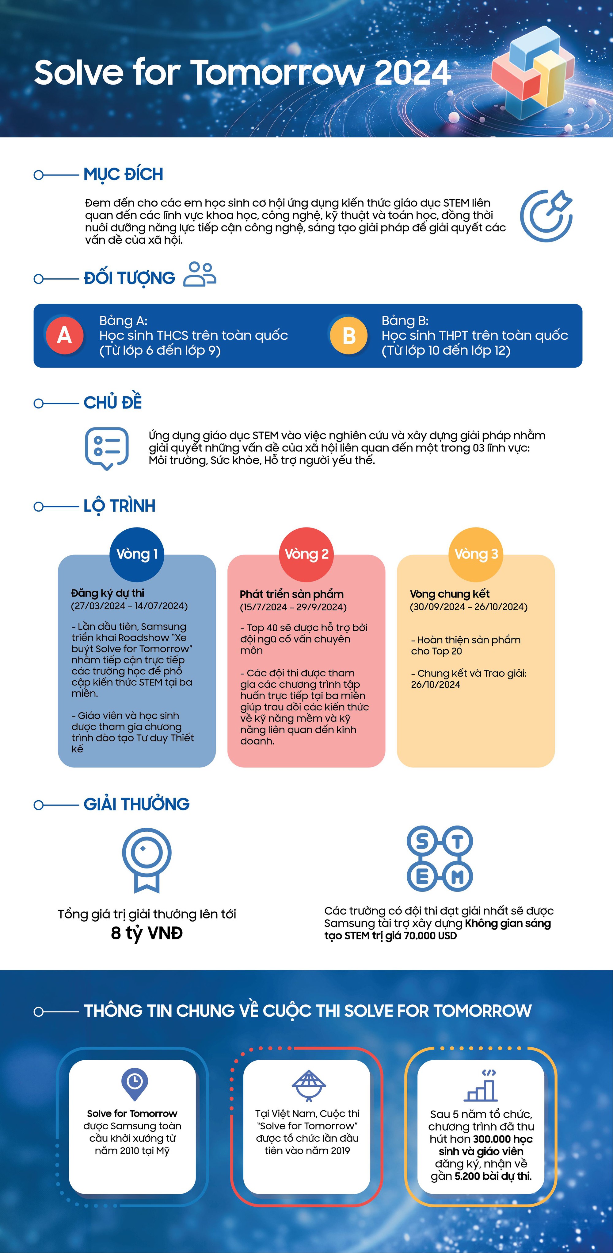 Tiếp nối thành công của cuộc thi những năm trước, Solve for Tomorrow 2024 sẽ được triển khai trong vòng 7 tháng, từ ngày 27/03/2024 đến hết ngày 26/10/2024 và được chia làm hai bảng: bảng A dành cho học sinh THCS, và bảng B dành cho học sinh THPT cùng với 3 vòng thi. Các em học sinh sẽ ứng dụng các kiến thức STEM và Tư duy thiết kế (design thinking) để tìm ra và hiện thực hóa các giải pháp sáng tạo nhằm xử lý các vấn đề xã hội hiện hữu.