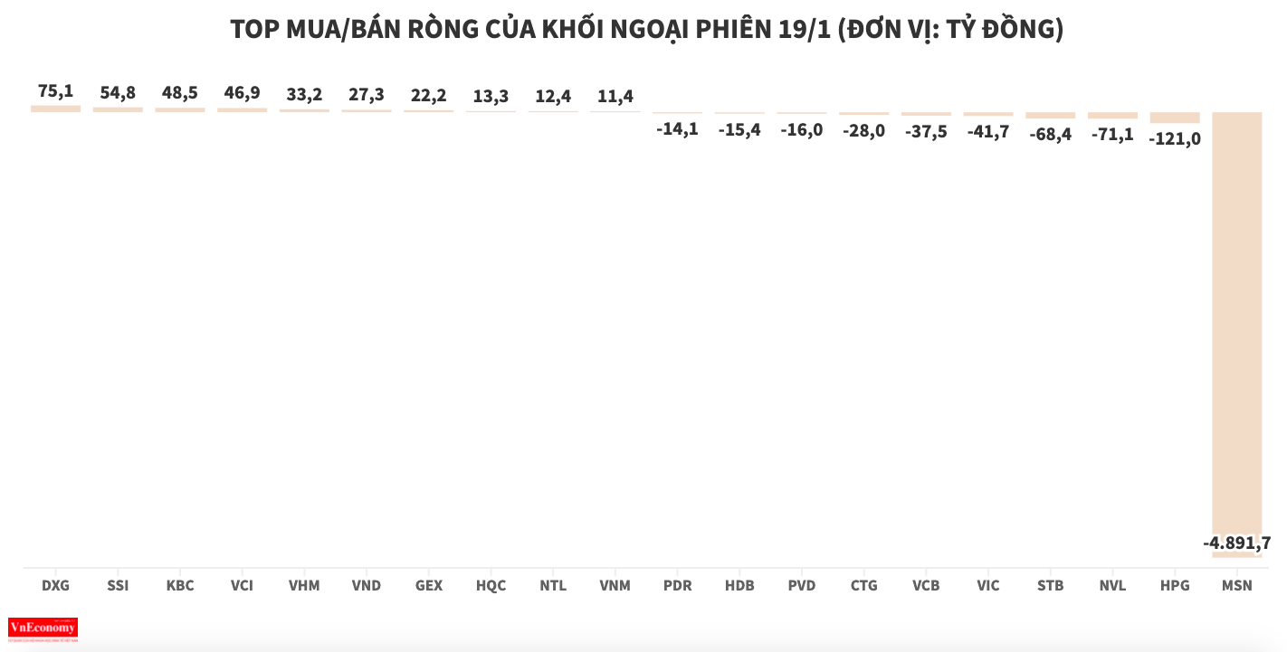 Hôm nay (19/1), thị trường ghi nhận sự hồi phục nhẹ sau những phiên giảm sâu. Tuy nhiên, trái với nhà đầu tư trong nước, khối ngoại lại xả ròng đột biến. Lực bán chủ yếu tập trung ở MSN với giá trị lên tới gần 5.000 tỷ đồng.