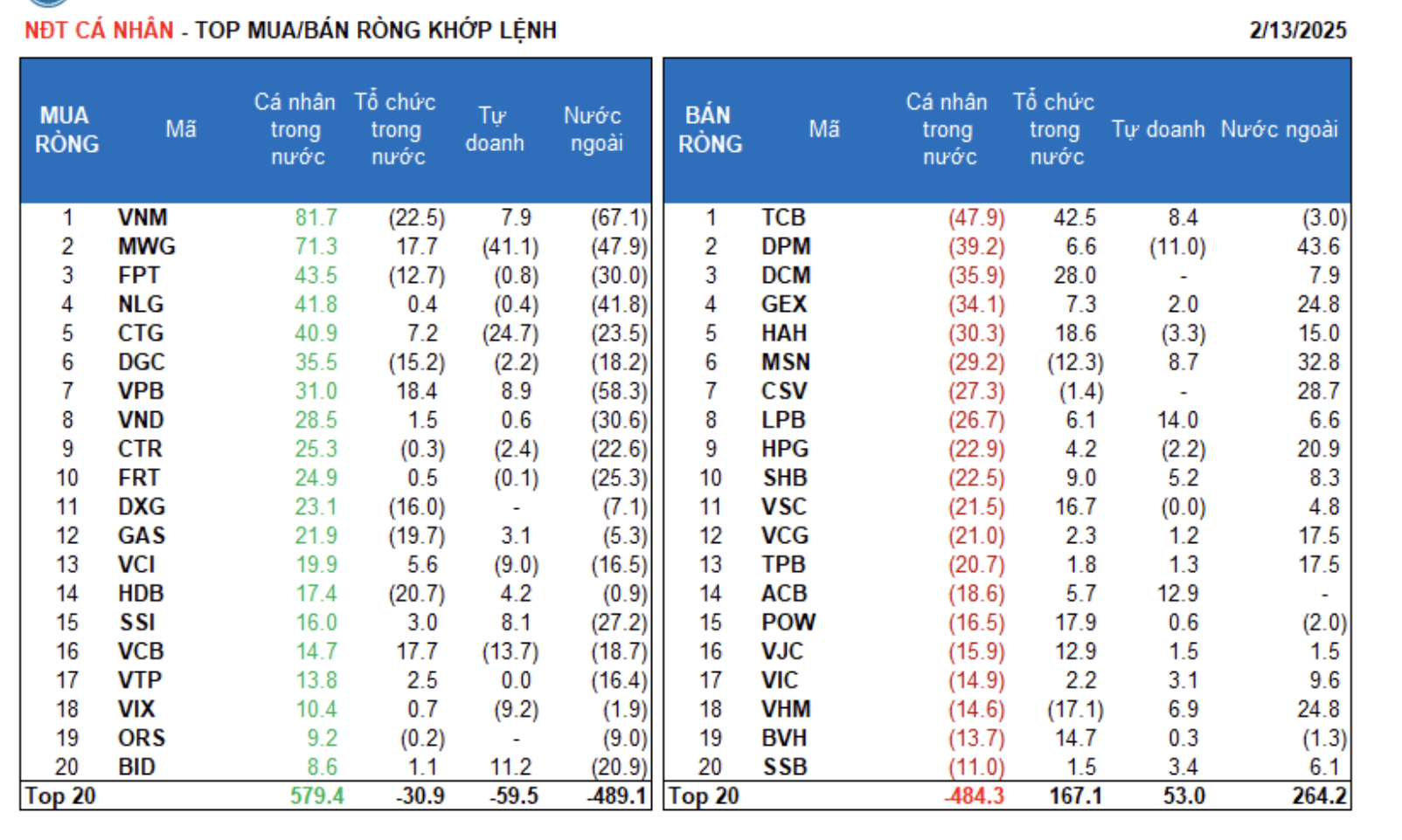 Tính riêng giao dịch khớp lệnh: Tổ chức trong nước bán ròng 6/18 ngành , giá trị lớn nhất là nhóm Thực phẩm và đồ uống Top bán ròng có VNM, MBB, VIB, HDB, GAS, VHM, FUEVFVND, DXG, DGC, FPT. Giá trị mua ròng lớn nhất là nhóm Ngân hàng. Top mua ròng có TCB, DCM, GMD, HAH, VPB, POW, VCB, MWG, VSC, BVH.