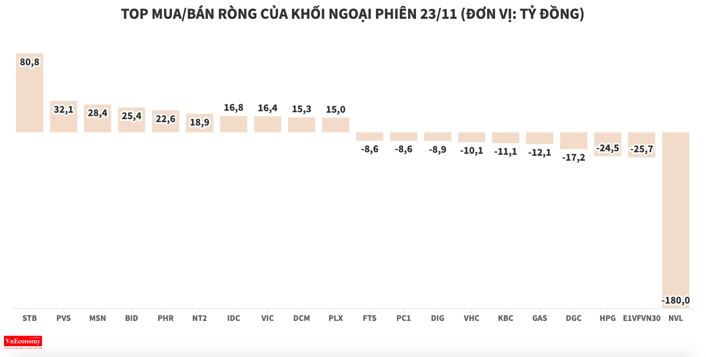 Hôm nay (23/11), mặc dù đã xả hơn 180 tỷ đồng cổ phiếu NVL, thế nhưng tổng hoà khối ngoại vẫn giữ trạng thái mua ròng tích cực.