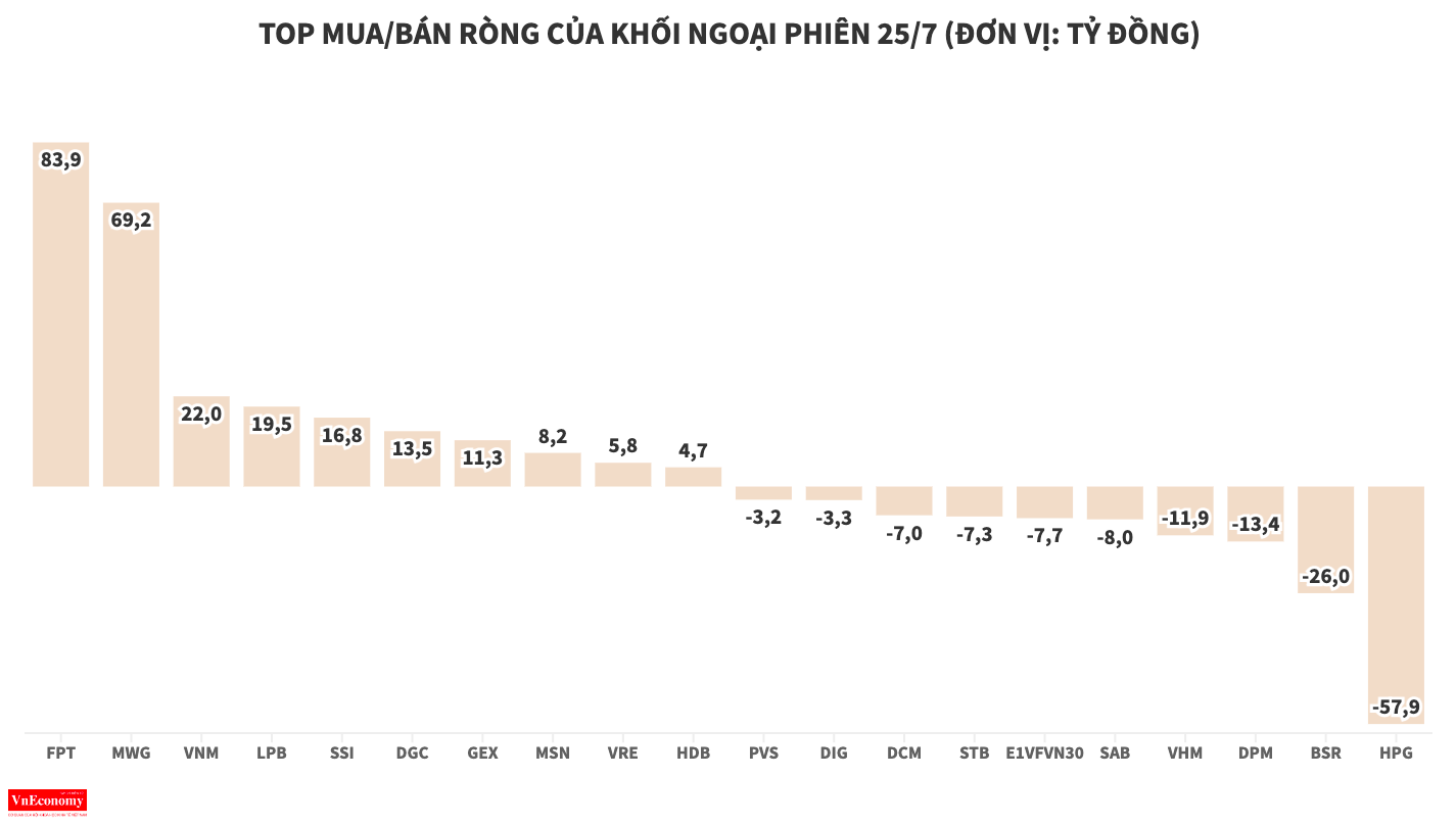 Hôm nay (25/7), khối ngoại tiếp tục duy trì trạng thái mua ròng. Tuy nhiên, lực mua chỉ tập trung vào một số mà blue-chips như FPT và MWG.