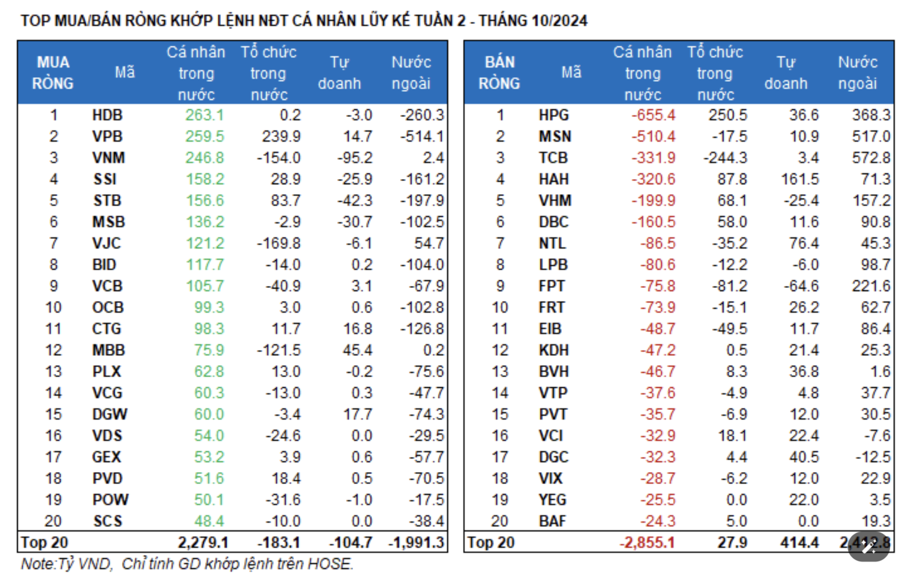 Tính riêng giao dịch khớp lệnh, họ mua ròng 9/18 ngành, chủ yếu là ngành Ngân hàng. Top mua ròng của nhà đầu tư cá nhân tập trung gồm: HDB, VPB, VNM, SSI, STB, MSB, VJC, BID, VCB, OCB.