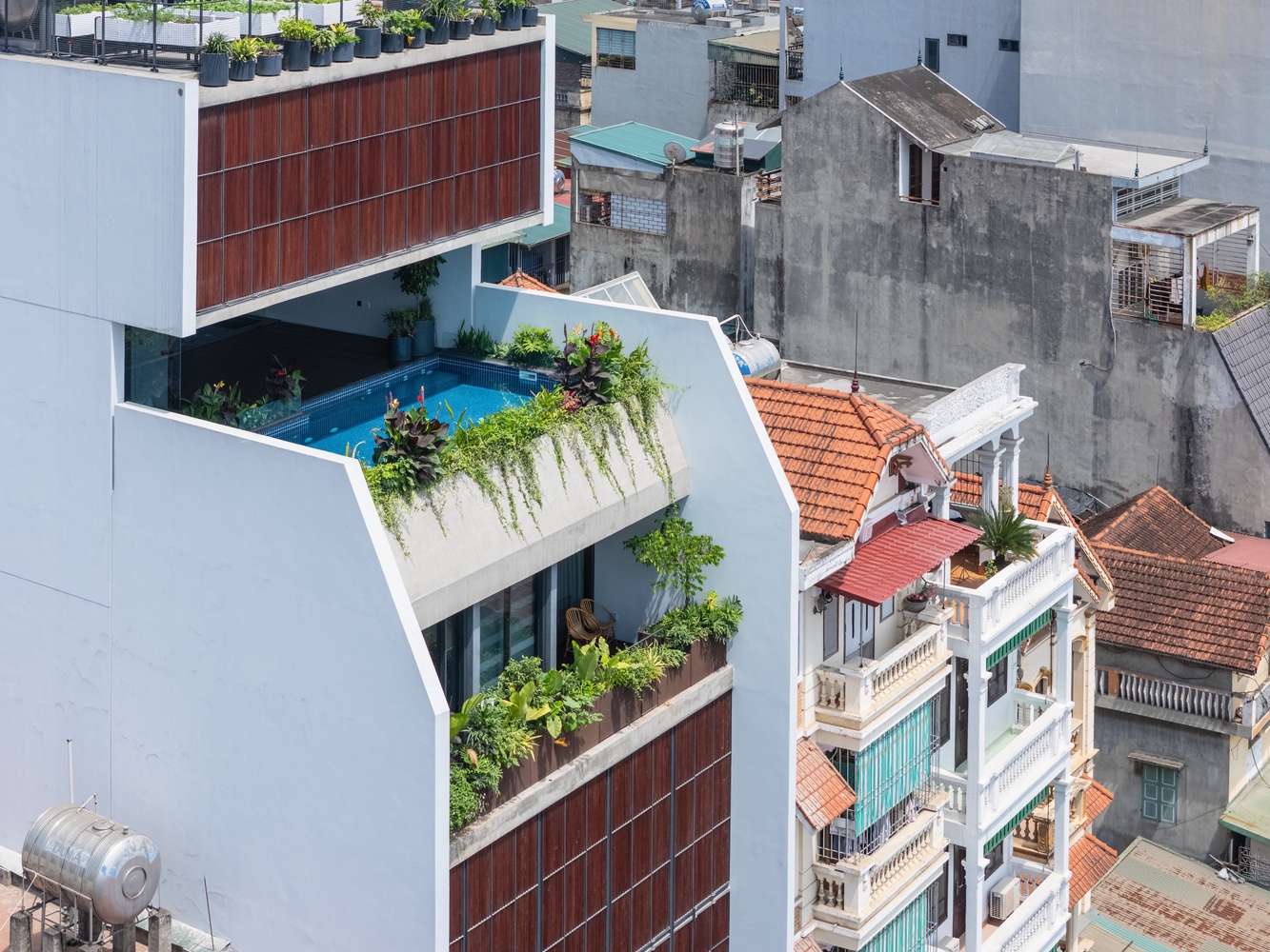 Tầng bảy dành riêng cho không gian thờ cúng của gia đình. Phía trên, sân thượng bố trí các chức năng kỹ thuật cùng với một khu vườn rau nhỏ. Tầng cao này mở ra tầm nhìn rộng lớn ra thành phố xung quanh và mang đến một không gian yên bình, hòa quyện với thiên nhiên cho gia đình.