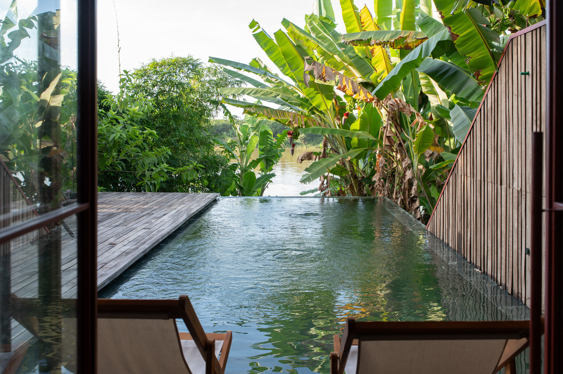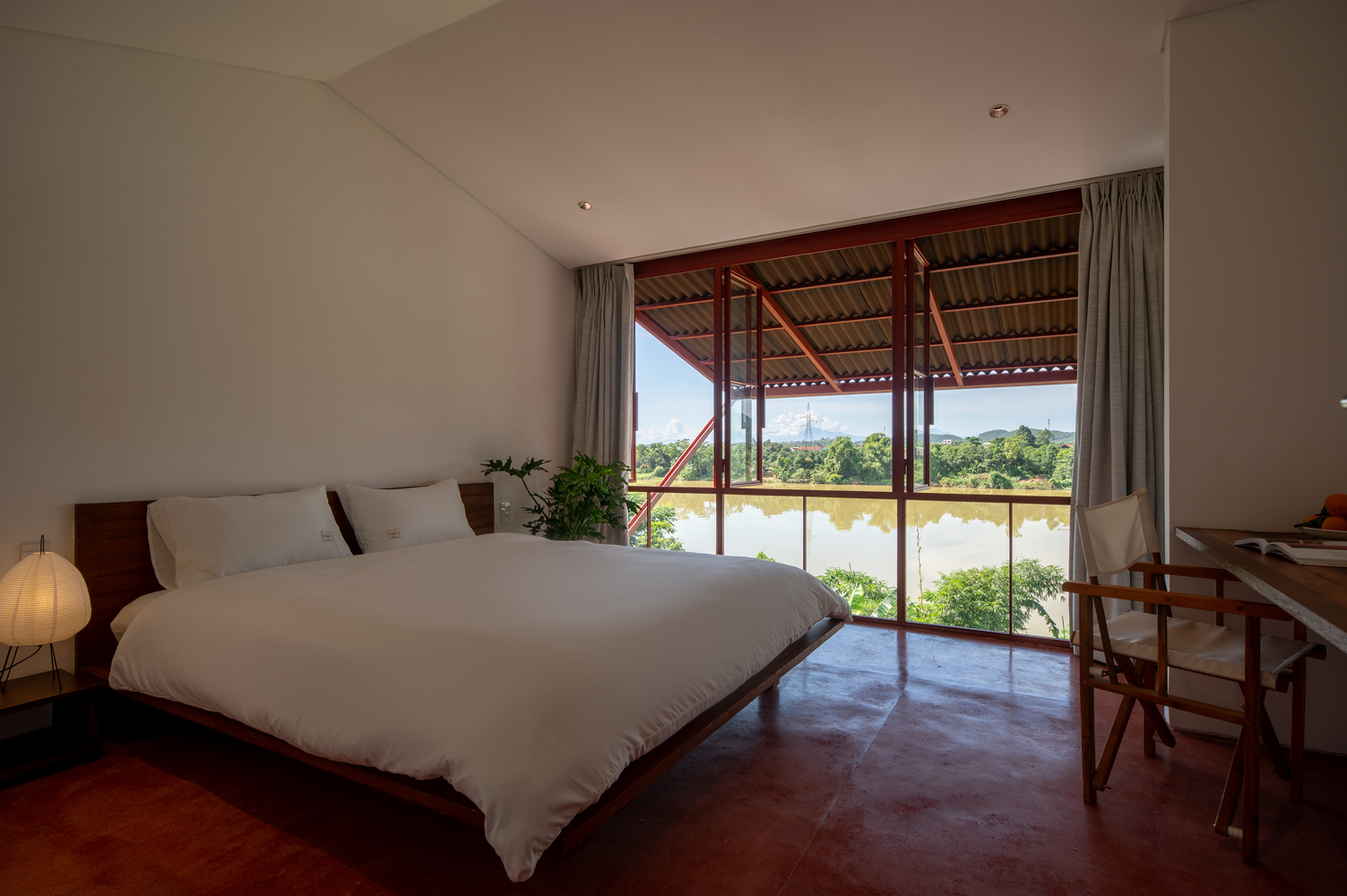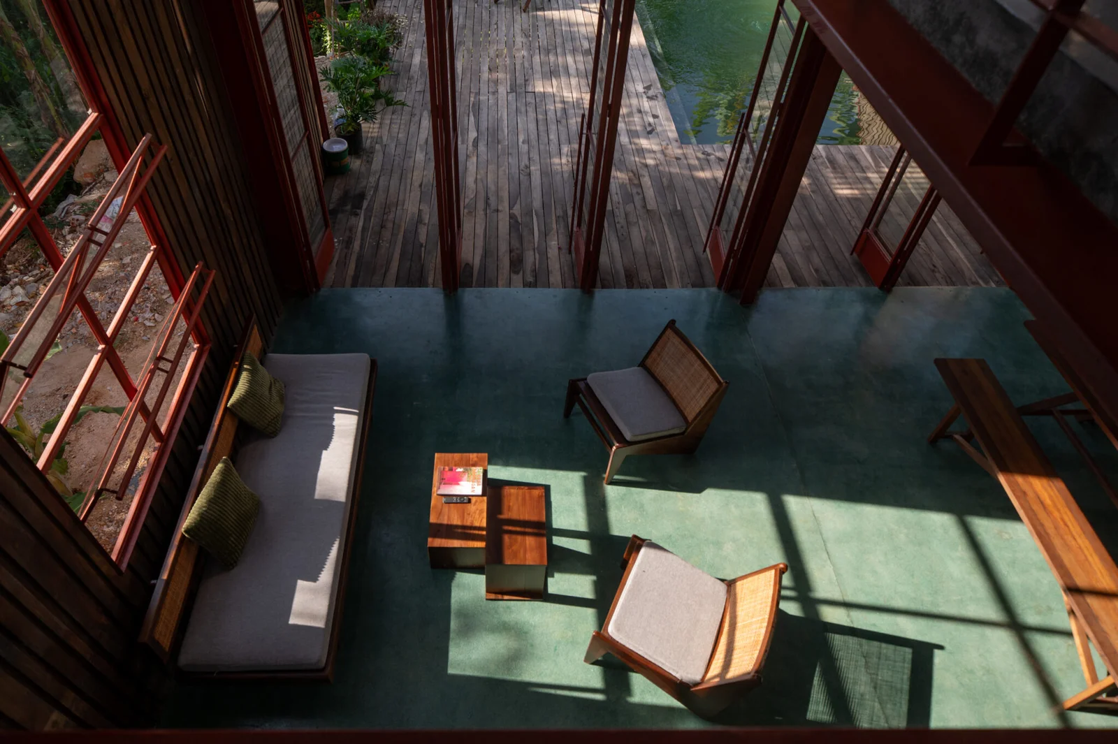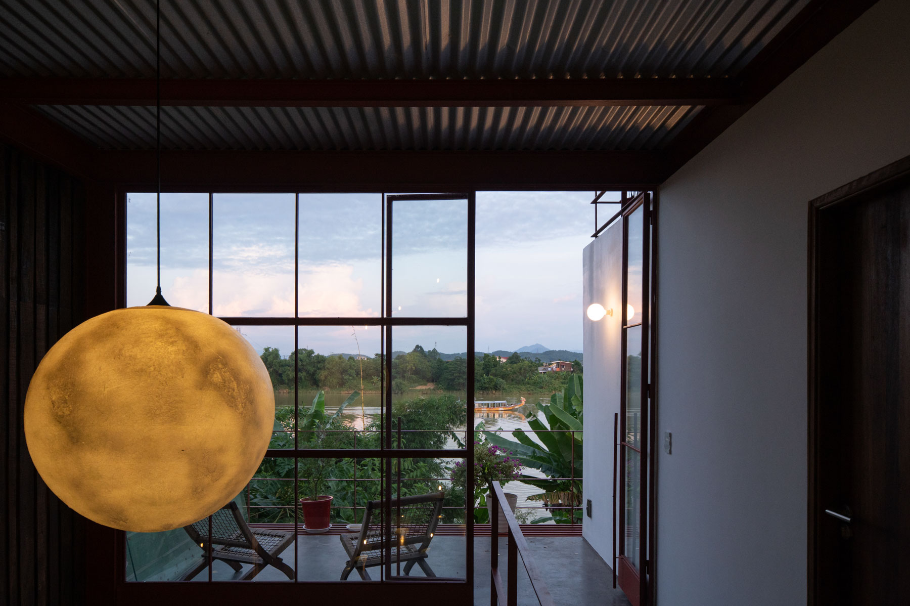 khách – nằm ở tầng trệt, mở hoàn toàn ra phía dòng sông bằng hệ cửa kính trượt