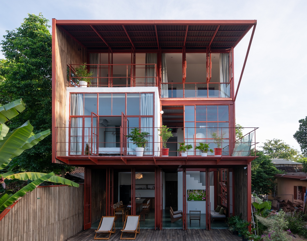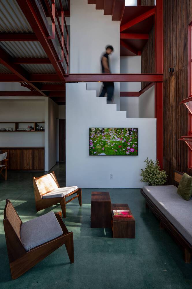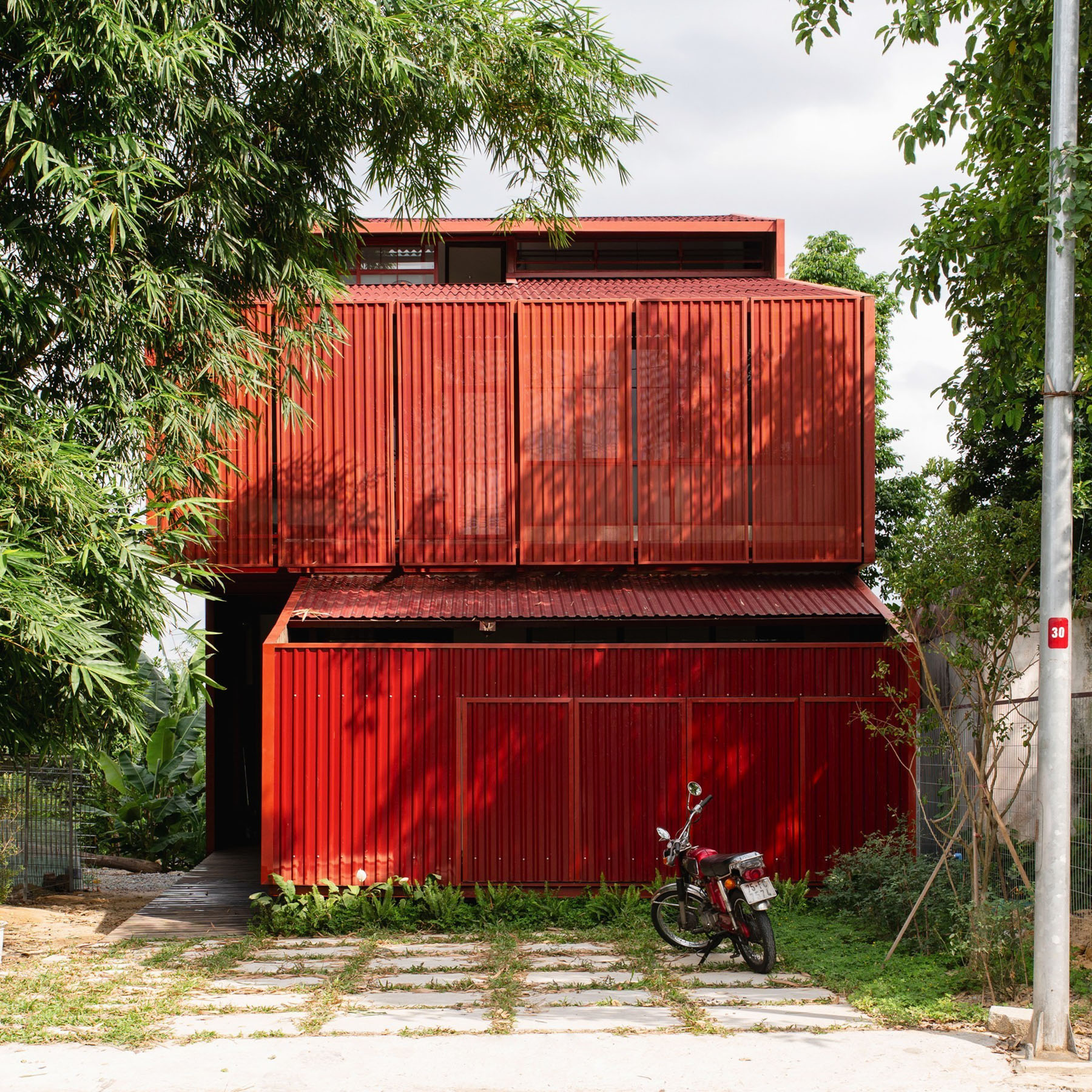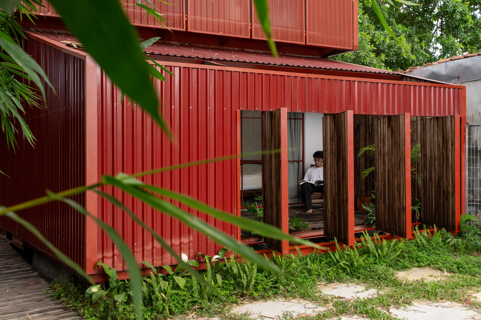 Sắc đỏ được sử dụng như một dấu hiệu nhận diện có chủ ý. Còn các vật liệu chủ đạo như mái tôn gân sóng, sàn bê tông mài, khung thép để oxy hóa tự nhiên, và lớp che nắng bằng gỗ… được xử lý theo hướng thô mộc, để lộ bản chất vật liệu. Chúng không được lựa chọn vì sự hoàn hảo, mà vì khả năng lão hóa tự nhiên theo thời gian, qua đó giảm chi phí bảo trì và gia tăng giá trị thẩm mỹ bền vững.