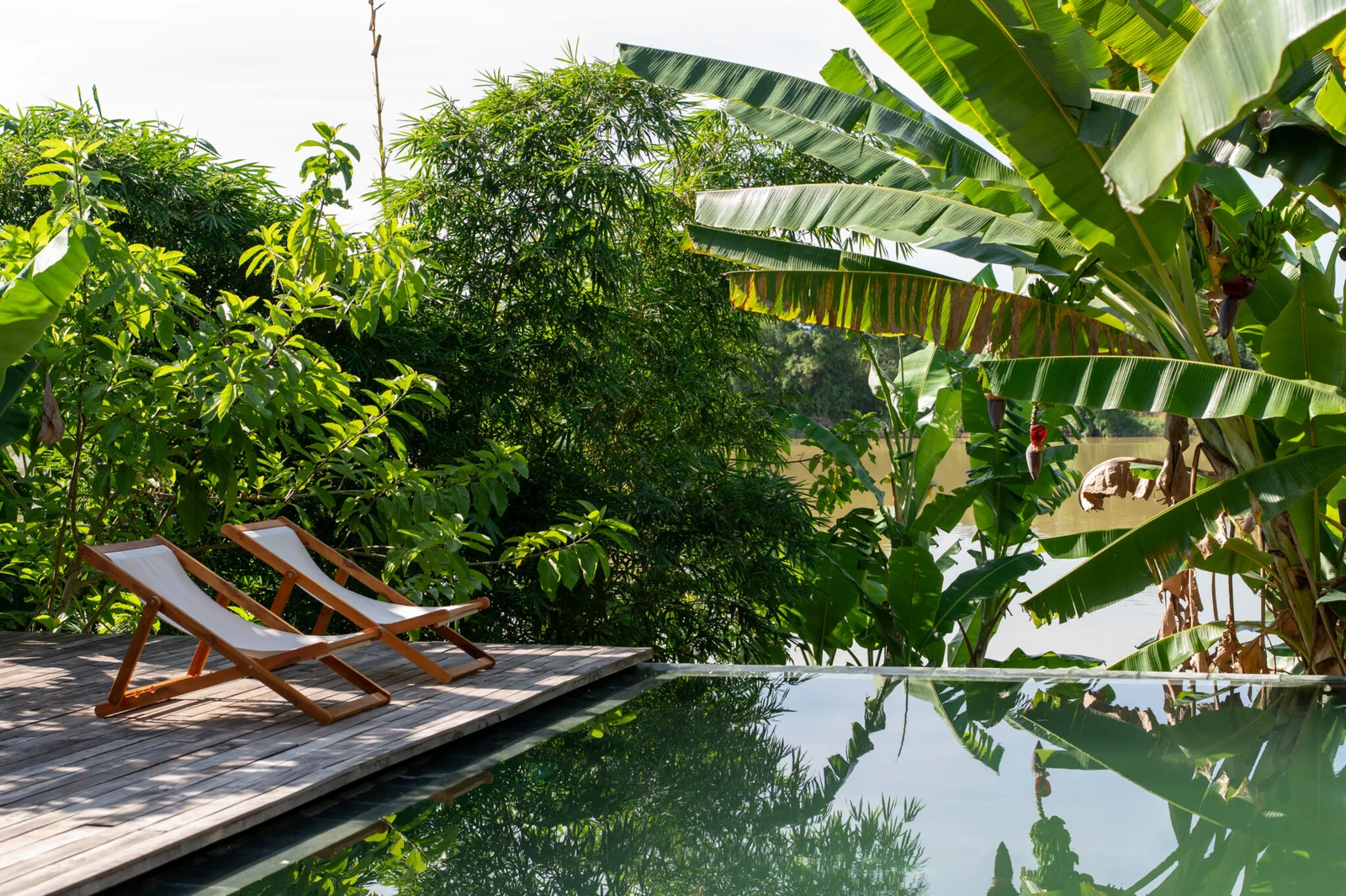 hướng sông, dẫn dắt chuyển động từ không gian riêng tư, qua hiên gỗ, đến hồ