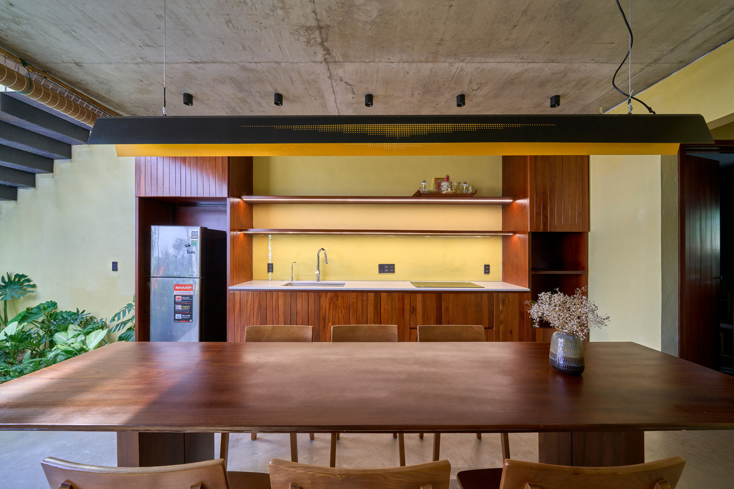 bởi nhịp sống đan xen với công việc. Ở trung tâm ngôi nhà, mái nhà dốc vào trong, dẫn nước mưa từ