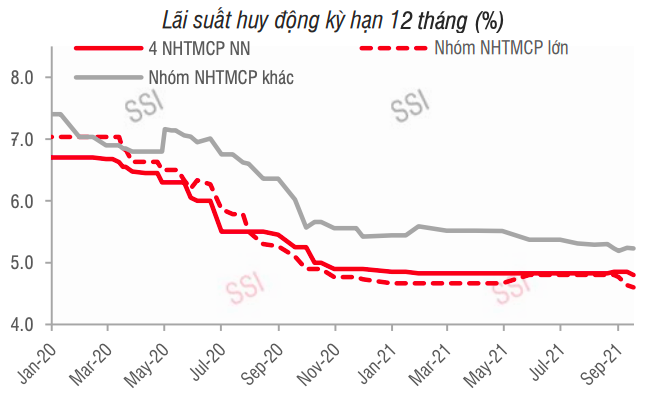 Đáng chú ý, theo Công ty Chứng khoán SSI: “Mặc dù chênh lệch tiền gửi – tín dụng tiếp tục thu hẹp kể từ tháng 11/2020, mức chênh lệch này chưa thực sự tạo áp lực và chúng tôi tiếp tục duy trì quan điểm lãi suất huy động vẫn tiếp tục đi ngang, thậm chí có thể giảm trong trường hợp Ngân hàng Nhà nước cần phải có các biện pháp nới lỏng chính sách tiền tệ mạnh mẽ hơn để hỗ trợ sự hồi phục của nền kinh tế sau đại dịch”.