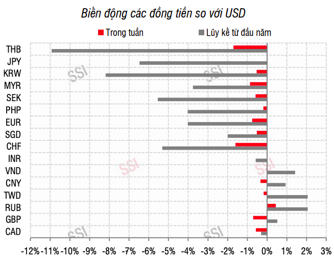 Quay lại với diễn biến tuần trước, tại thị trường ngoại hối, các dữ liệu kinh tế tích cực trong tuần qua củng cố đà phục hồi của nền kinh tế Mỹ và gia tăng kỳ vọng rằng Fed có thể thu hẹp quy mô mua tài sản sớm hơn. Điều này thúc đẩy đồng USD và lợi tức trái phiếu chính phủ Mỹ tăng. Hầu hết các đồng tiền chủ chốt đều giảm giá so với USD như EUR -0,75%, GBP -0,71%, CAD -0,57%.