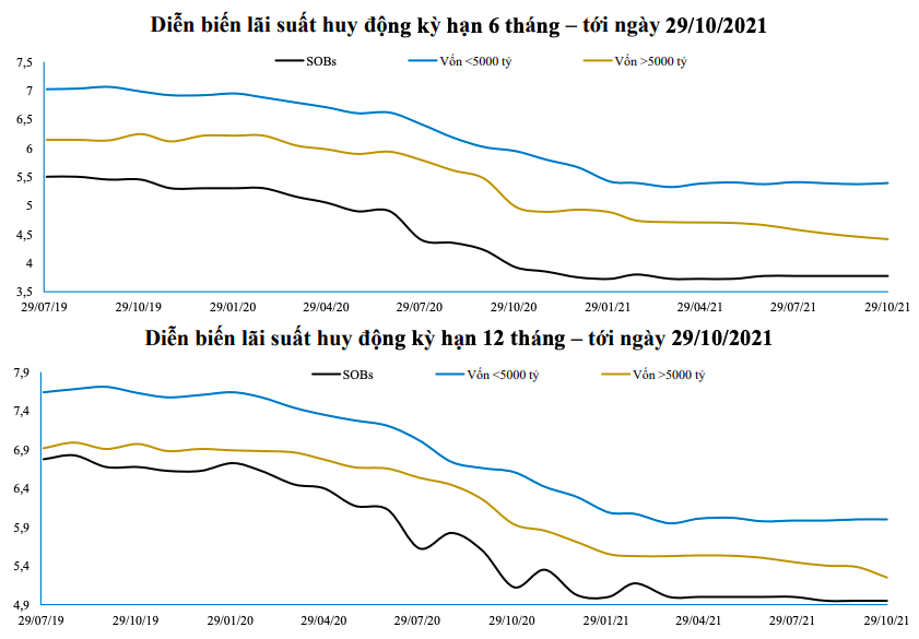 Cụ thể, trung bình lãi suất huy động 6 tháng và 12 tháng giảm lần lượt 0,01 và 0,06 điểm phần trăm, lần lượt xuống 4,70% và 5,50% vào thời điểm cuối tháng 10.