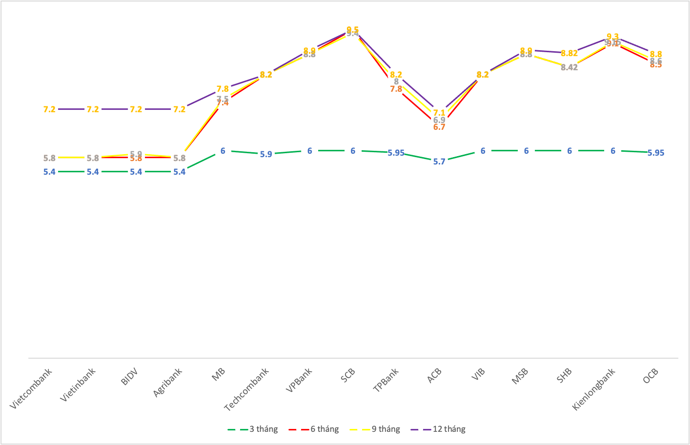 Ở các kỳ hạn từ 6-12 tháng, SCB là ngân hàng có lãi suất cao nhất, từ 9,4-9,5%/năm.