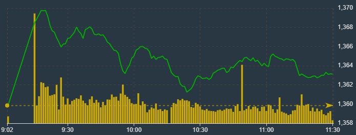Chỉ số chính đến hết phiên sáng còn tăng 3,28 điểm, tương đương 0,24%. Mức tăng cao nhất của chỉ số này ngay đầu phiên khoảng 0,77% so với tham chiếu. Như vậy VN-Index cũng mới trả lại thị trường hơn 7 điểm.