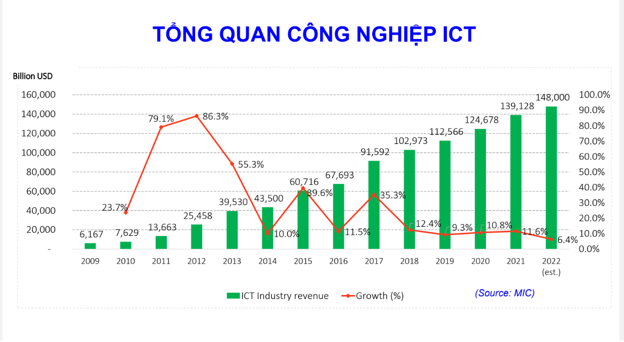 Cụ thể, trong năm 2022 doanh thu lĩnh vực công nghiệp công nghệ thông tin đạt 148 tỷ USD; trong đó, phần mềm chiếm khoảng 6 tỷ USD, phần cứng điện tử là 135 tỷ USD chiếm tỷ trọng 17,8% toàn ngành công nghiệp.