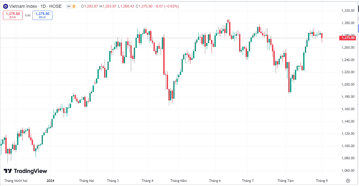 "Dưới áp lực từ thị trường thế giới, VN-Index trong phiên giao dịch đầu tháng 9 giảm điểm khá mạnh ngay từ đầu phiên. VN-Index tạo khoảng trống giảm giá về vùng 1.270 điểm với áp lực chính đến từ VN30 khi VN30 gặp vùng đỉnh tháng 6/2024 tương ứng 1330 điểm - 1340 điểm. VN-Index sau đó dần phục hồi trở lại dưới ảnh hưởng khá tích cực của các cổ phiếu bất động sản, xây dựng. Kết phiên VN-Index còn giảm 8,07 điểm (-0,63%) về mức 1275,80 điểm. Trong khi VN30 giảm 1,04% về mức 1317,71 điểm với khối lượng giao dịch tăng 32,64% so với phiên trước, thể hiện áp lực điều chỉnh khá mạnh.