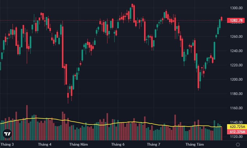 VN-Index đóng cửa ở mức 1282,78 điểm, vẫn chưa có tín hiệu rõ nét nào là sẽ quay đầu tạo đỉnh ngắn hạn. Cơ hội để chỉ số đột phá hoặc ít nhất là chạm tới mốc 1300 điểm vẫn còn, nhưng cần sự đồng thuận của các cổ phiếu vốn hóa lớn. Dòng tiền yếu là một hạn chế đáng kể lúc này.