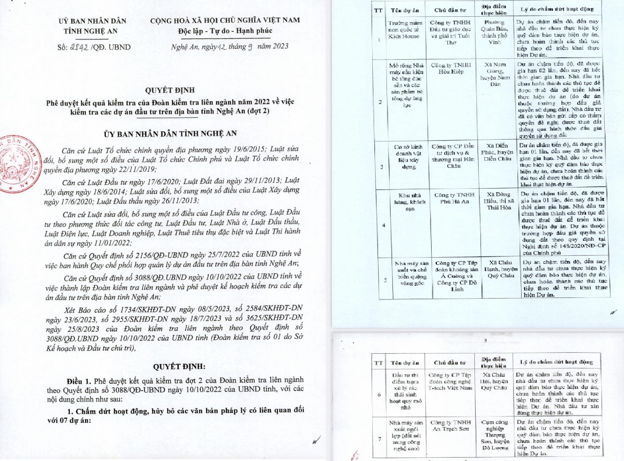 Theo đó, UBND tỉnh Nghệ An quyết định chấm dứt hoạt động, huỷ bỏ các văn bản pháp lý có liên quan đối với 7 dự án chậm tiến độ trên địa bàn.