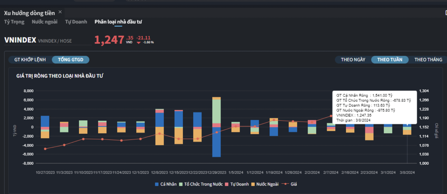 VN-Index đóng cửa tuần giao dịch thứ 10/2024 tại 1.247,35 điểm, giảm -10,93 điểm tương đương -0,87% so với mức đóng cửa tuần thứ 8, với thanh khoản đột biến.