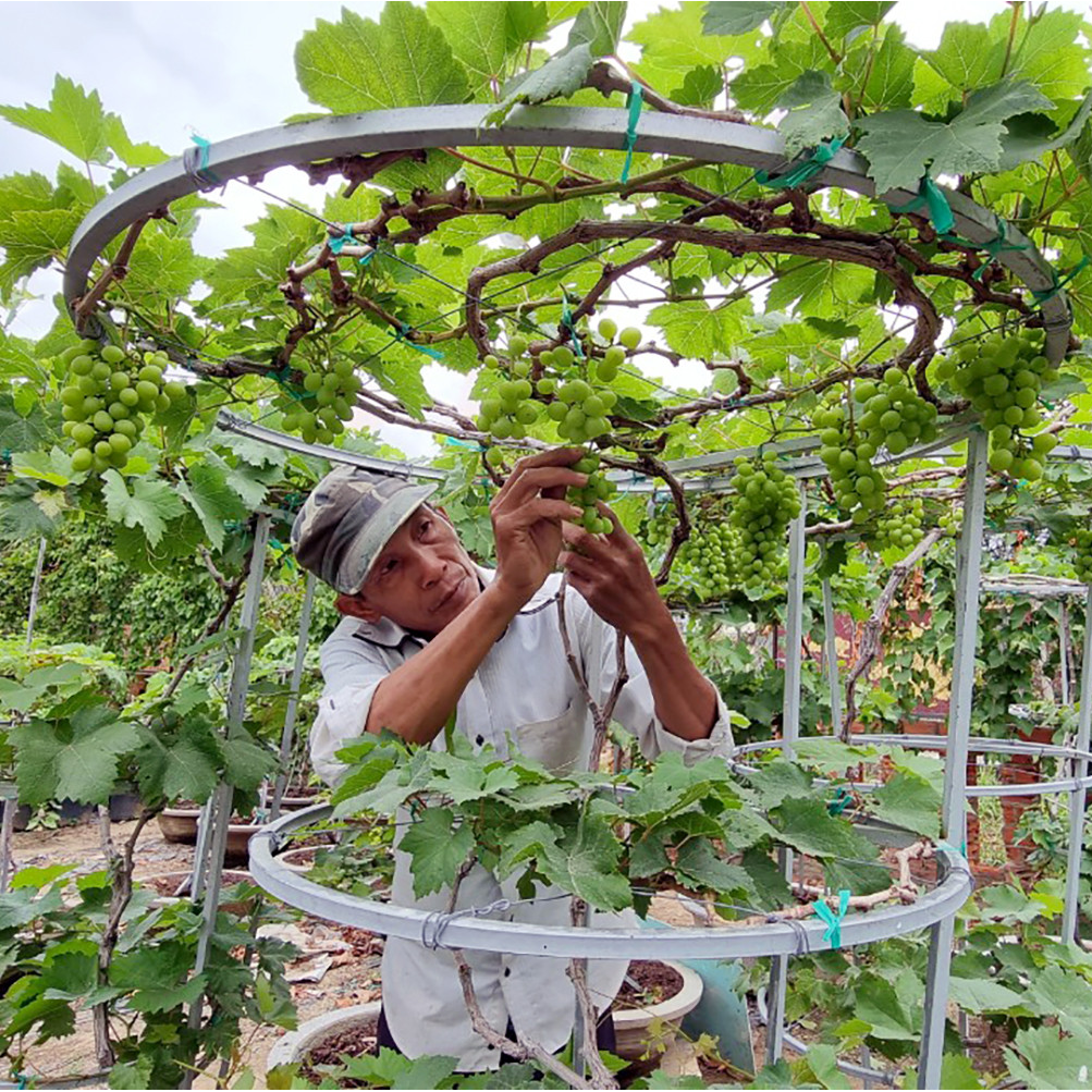 Tương tự, những ngày này, các nhà vườn, hợp tác xã trồng nho cảnh tại Ninh Thuận đang tất bật chăm sóc, chuẩn bị hàng nghìn chậu nho cảnh với nhiều kiểu dáng độc đáo để cung ứng cho thị trường Tết Nguyên Đán Ất Tỵ 2025. Bên cạnh những giống nho truyền thống đã được người tiêu dùng ưu thích, các chủ vườn còn bổ sung thêm cho vườn nho cảnh của mình một số giống nho mới như ngón tay đen, hồng Nhật, Kyoho của Hàn Quốc, nho kẹo, Bailey...