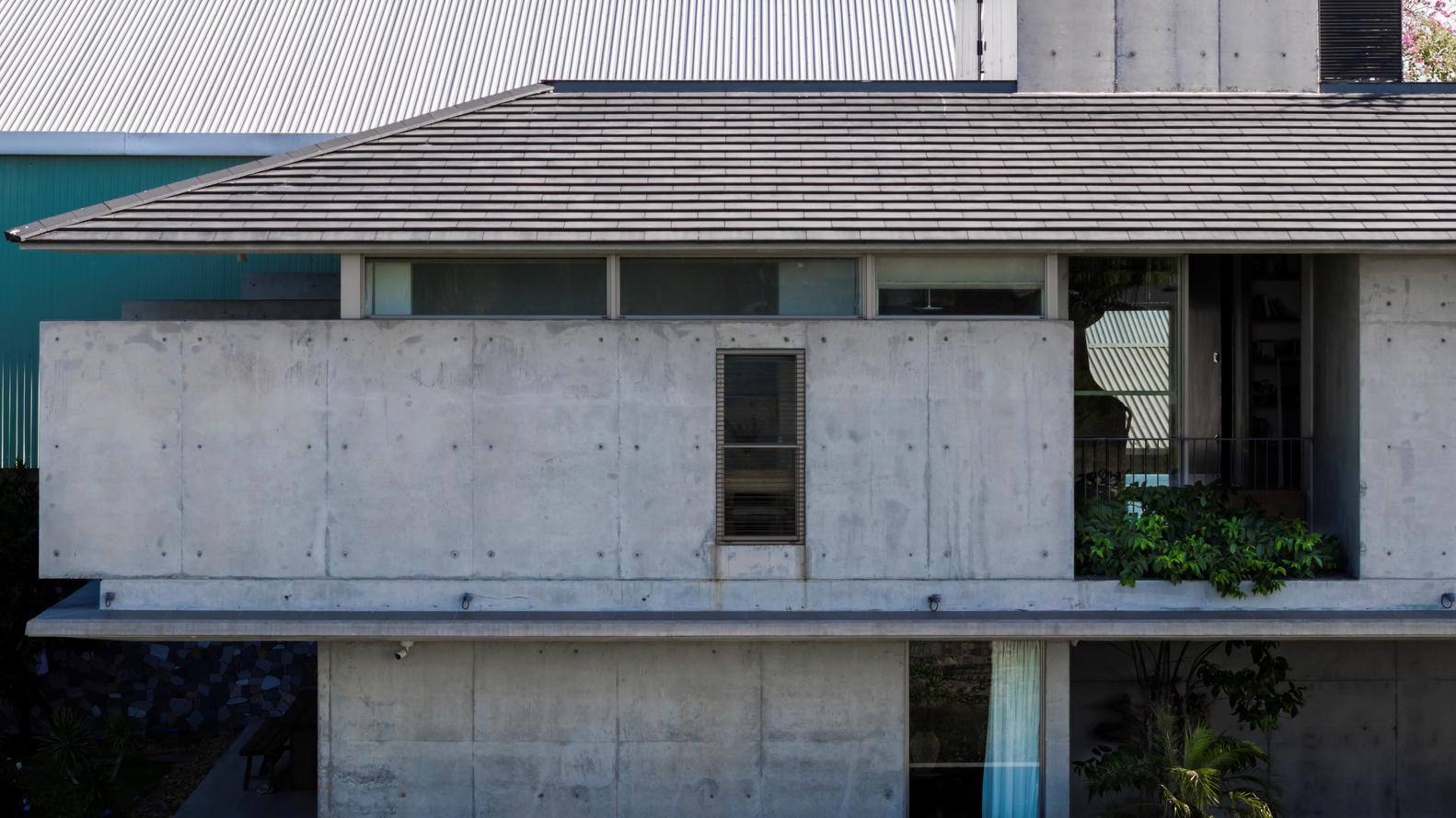 Hai không gian này tạo thành một khối hình chữ "T", với một cánh riêng tư hơn (bao gồm phòng ngủ và phòng làm việc) hướng ra con đường đất, trong khi không gian sinh hoạt chung mở rộng ra khu vườn và hoàn toàn thông thoáng. Việc đặt khối phòng ngủ vuông góc với con đường nhỏ tạo ra một loại "vùng đệm", mang lại sự riêng tư cao cho phòng khách, bếp và khu vực hồ bơi.