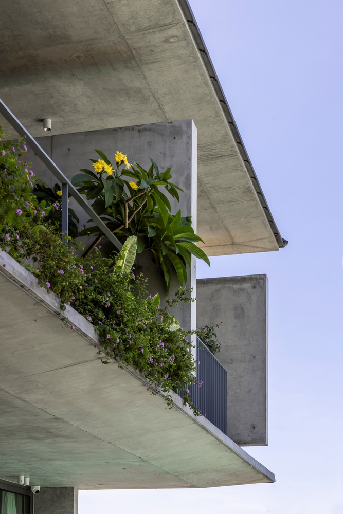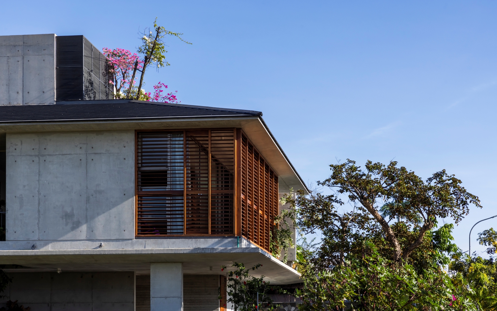 Kiến trúc mở về phía đông để đón gió từ sông, nơi những tấm bê tông trần được sắp xếp cẩn thận vừa che chắn vừa lọc ánh sáng ban mai. Ngược lại, mặt tiền hướng Tây, tiếp xúc với ánh nắng gay gắt nhất, được xử lý bằng lớp vỏ hai lớp: hệ thống lam gỗ bên ngoài có thể vận hành và lớp cây xanh bên trong giúp điều hòa vi khí hậu trước khi không khí vào bên trong.
