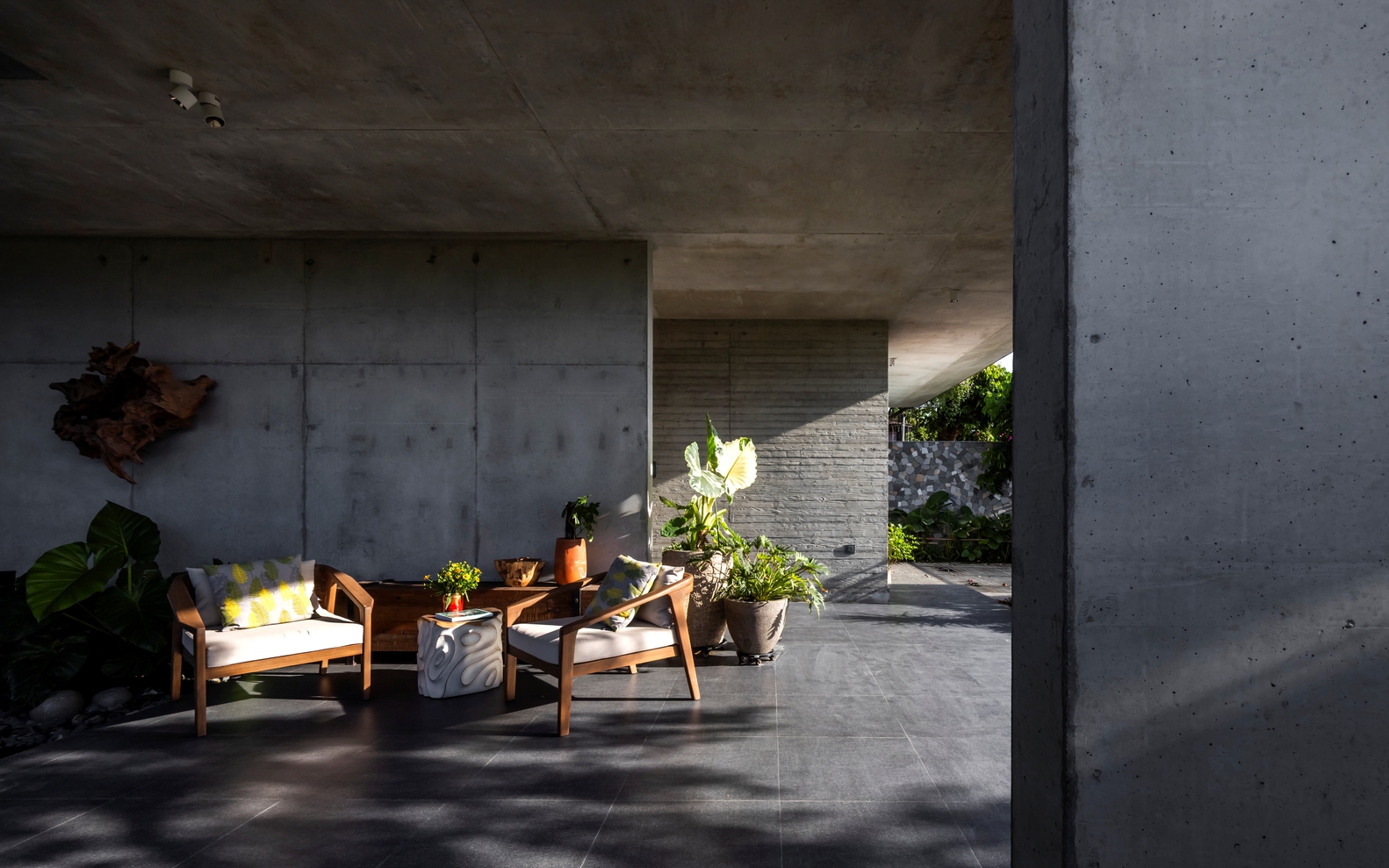 Theo các kiến trúc sư từ văn phòng Be4 Architecture, bê tông trần đóng vai trò chủ đạo trong bảng màu vật liệu, được giữ nguyên để lưu giữ mọi dấu ấn xây dựng như một phần câu chuyện của tòa nhà. Khi ánh sáng mặt trời chiếu vào những bề mặt này, chúng trở nên dịu nhẹ về mặt thị giác, tỏa ra một sự ấm áp tinh tế, như thể biệt thự có một lớp da thứ hai đang thở.