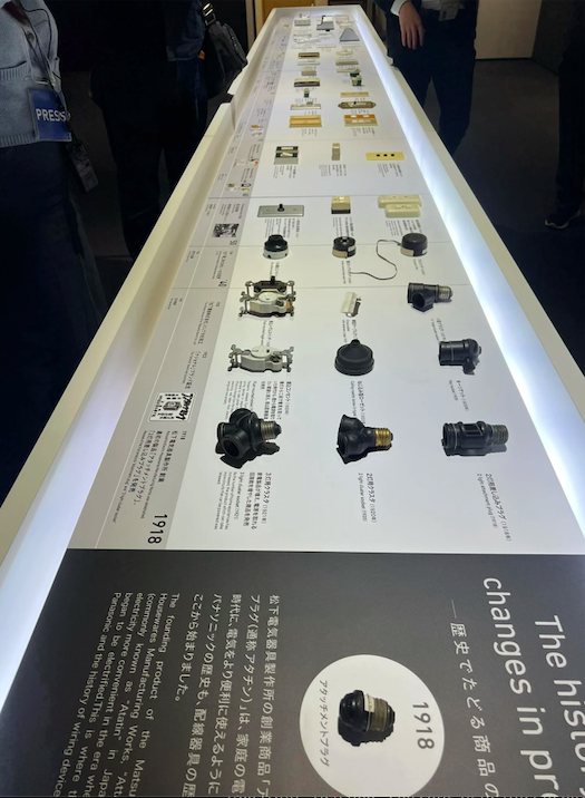 Đại diện Panasonic Electric Works giới thiệu với đoàn tham quan đến từ Việt Nam, cho biết sản phẩm sơ khai của Panasonic là chuôi đèn một bóng. Ở thời kỳ này các gia đình tại Nhật Bản đều đã bắt đầu sử dụng điện tuy nhiên việc sử dụng điện chỉ bắt nguồn từ một nguồn điện duy nhất vào nhà là từ đường dây bóng đèn được gắn trên trần nhà nên rất khó để sử dụng nhiều sản phẩm điện cùng một lúc. Thêm nữa, dây điện ngày đầu được cuốn bằng giấy nên cũng không “đi” được vào trong tường.