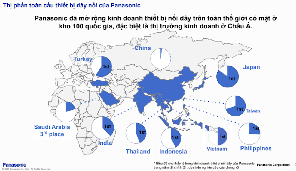 Các thiết bị nối dây của Panasonic bắt đầu xuất khẩu vào những năm 1980 và đến thời điểm hiện tại, sản phẩm của Panasonic Electric Works đã có mặt tại hơn 100 quốc gia và vùng lãnh thổ, trong đó chiếm thị phần cao tại nhiều quốc gia và vùng lãnh thổ như Thổ Nhĩ kỳ, Ấn Độ, Việt Nam, Indonesia, Thái Lan, Đài Loan…