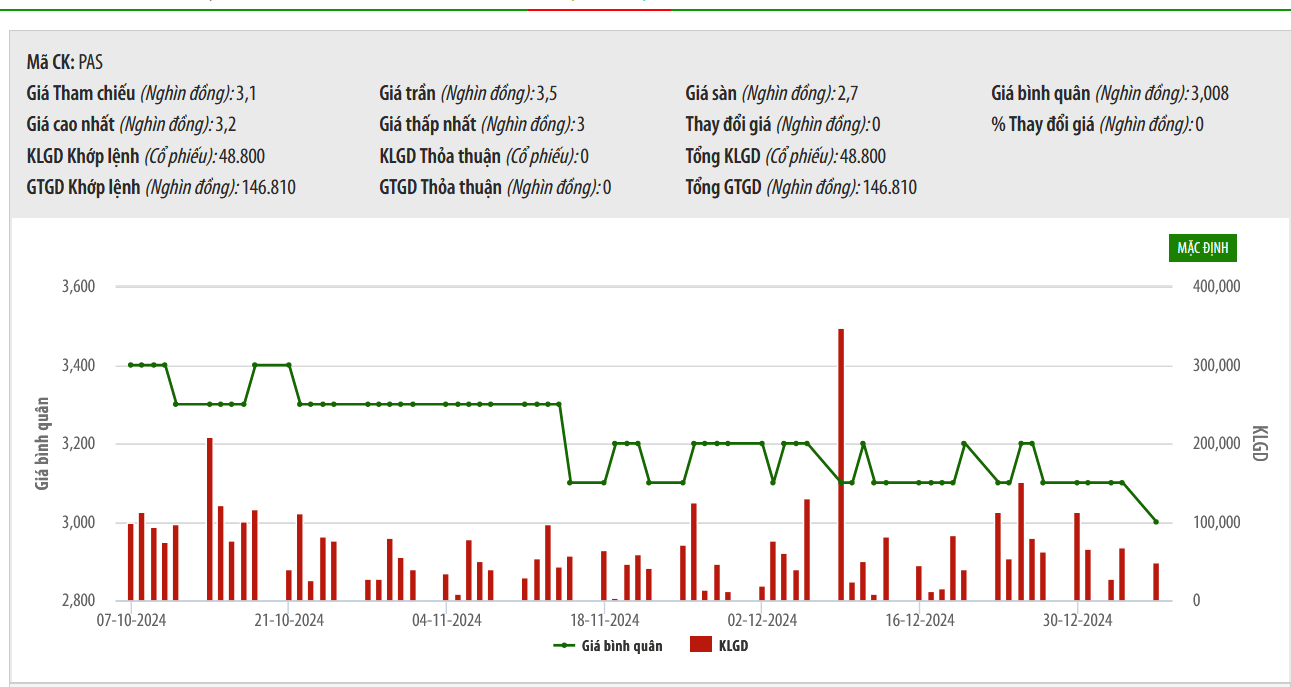 Trong đó, PAS bị phạt 60 triệu đồng theo quy định tại điểm a khoản 3 Điều 42 Nghị định số 156/2020/NĐ-CP ngày 31/12/2020 của Chính phủ quy định xử phạt vi phạm hành chính trong lĩnh vực chứng khoán và thị trường chứng khoán (Nghị định số 156/2020/NĐ-CP) do Công bố thông tin không đúng thời hạn theo quy định pháp luật (Công ty công bố thông tin không đúng thời hạn đối với các Nghị quyết Hội đồng quản trị số 18/2022/NQ-HĐQT ngày 30/12/2022, số 0809/2023/NQ-HĐQT-PAS ngày 08/9/2023, số 0106/2023/NQ-HĐQT-PAS ngày 01/6/2023, số 20/2023/NQ-HĐQT-PAS ngày 25/12/2023, số 05A/2022/NQ-HĐQT-PAS ngày 28/4/2022, số 20A/2023/NQ-HĐQT- PAS ngày 25/12/2023).