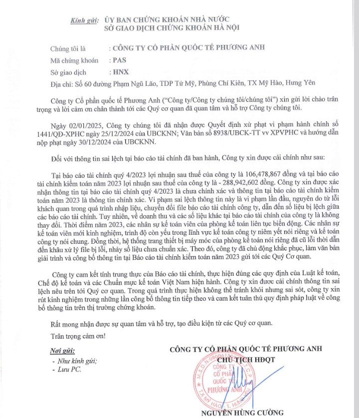 CTCP Quốc tế Phương Anh (mã PAS-UPCoM) vừa có văn bản giải trình và cải chính thông tin.