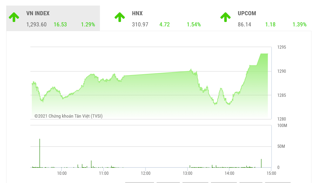 "VN-Index duy trì sắc xanh trong cả phiên giao dịch và hiện đã trở lại trên ngưỡng 1290. Dòng tiền đầu tư tăng mạnh với 16/19 nhóm ngành tăng điểm. Trong khi đó, khối ngoại bán ròng trên sàn HSX và mua ròng trên sàn HNX. Ngoài ra, độ rộng thị trường chuyển sang trạng thái tích cực với thanh khoản gia tăng so với phiên trước.