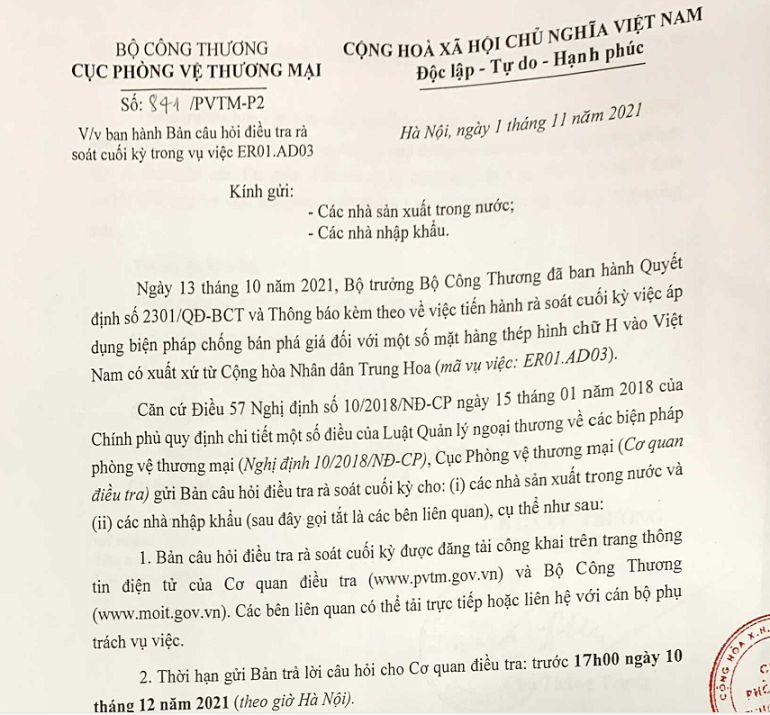 Trước đó, ngày 13/10/2021, Bộ trưởng Bộ Công Thương đã ban hành Quyết định số 2301/QĐ-BCT và Thông báo kèm theo về việc tiến hành rà soát cuối kỳ việc áp dụng biện pháp chống bán phá giá đối với một số mặt hàng thép hình chữ H vào Việt Nam có xuất xứ từ Trung Quốc.