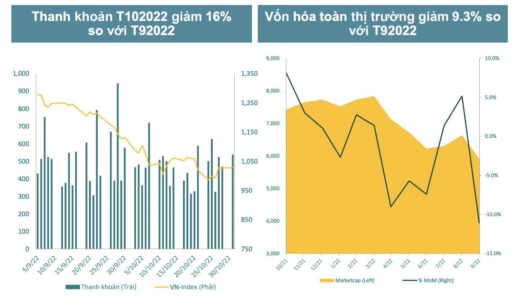 Vốn hóa toàn thị trường giảm -9,3% so với tháng 9, ghi nhận mức giảm 2 tháng liên tiếp. Vốn hóa do vậy cũng đã giảm 30,7% so với số đầu năm từ sự giảm giá trên diện rộng.