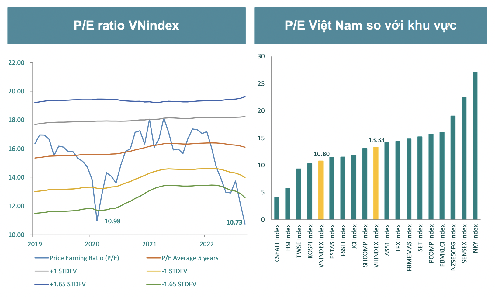 P/E VN-Index kết thúc T10 ở mức 10,9 lần, giảm 9,9% so với tháng 9, và cũng là mức thấp tương đương giai đoạn tháng 3/2020 (thị trường giảm mạnh vì Covid). P/E VN-Index do vậy giảm thêm 2 bậc về thứ 5 của các châu Á, trong khi P/E HNX-Index ở mức 13,3 lần – đứng thứ 10 khu vực.