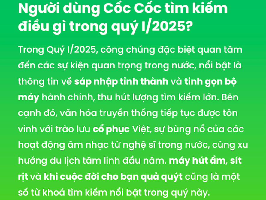 Báo cáo xu hướng tìm kiếm quý 1/2025 vừa được trình duyệt và công cụ tìm kiếm Cốc Cốc công bố cho biết lượng tìm kiếm kỷ lục đổ dồn vào các sự kiện chính trị - xã hội quan trọng, trong đó thông tin về sáp nhập tỉnh thành được tìm kiếm nhiều nhất…