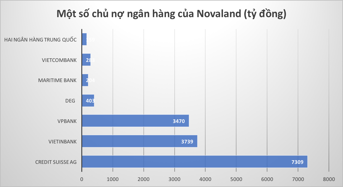 Credit Suisse AG, Chi nhánh Singapore là chủ nợ lớn nhất của Novaland với tổng nợ 7.309 tỷ đồng; Ngân hàng TMCP Việt Nam Thịnh Vượng 3.470 tỷ đồng; Vay DEG (định chế tài chính thuộc Ngân hàng Tái thiết KFW Đức) 430 tỷ đồng; các ngân hàng Trung Quốc…