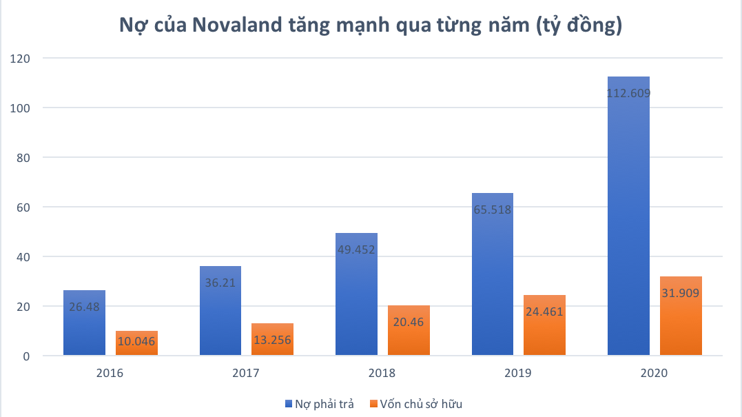 Để có vốn đầu tư dàn trải các dự án, mua hàng loạt công ty, Novaland tiếp tục tăng vay nợ các ngân hàng và phát hành trái phiếu. Tính đến ngày 31/12/2020, nợ phải trả của Novaland lên đến 112.609 tỷ đồng, tăng gần gấp đôi con số cuối năm 2019 (65.518 tỷ đồng). Nếu so với tổng cộng nguồn vốn thì nợ phải trả chiếm đến gần 78%, và gấp 3,5 lần vốn chủ sở hữu.