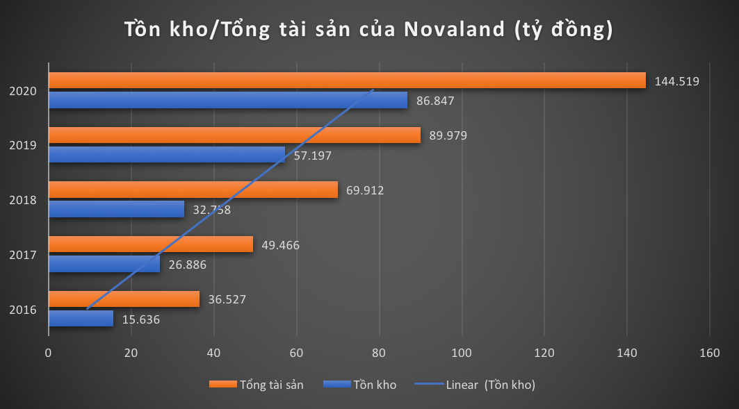 Tính đến cuối năm 2020, tồn kho của Novaland ở con số 86.847 tỷ đồng, tăng mạnh so với con số 57.205 tỷ đồng ở thời điểm cuối năm 2019, tăng 52%. Hàng tồn kho chiếm đến 60% tổng tài sản. Hàng tồn kho tăng cũng dẫn đến dòng tiền từ hoạt động kinh doanh của Novaland âm 3.289 tỷ đồng, trong khi cùng kỳ năm ngoái dương 3.076 tỷ đồng.