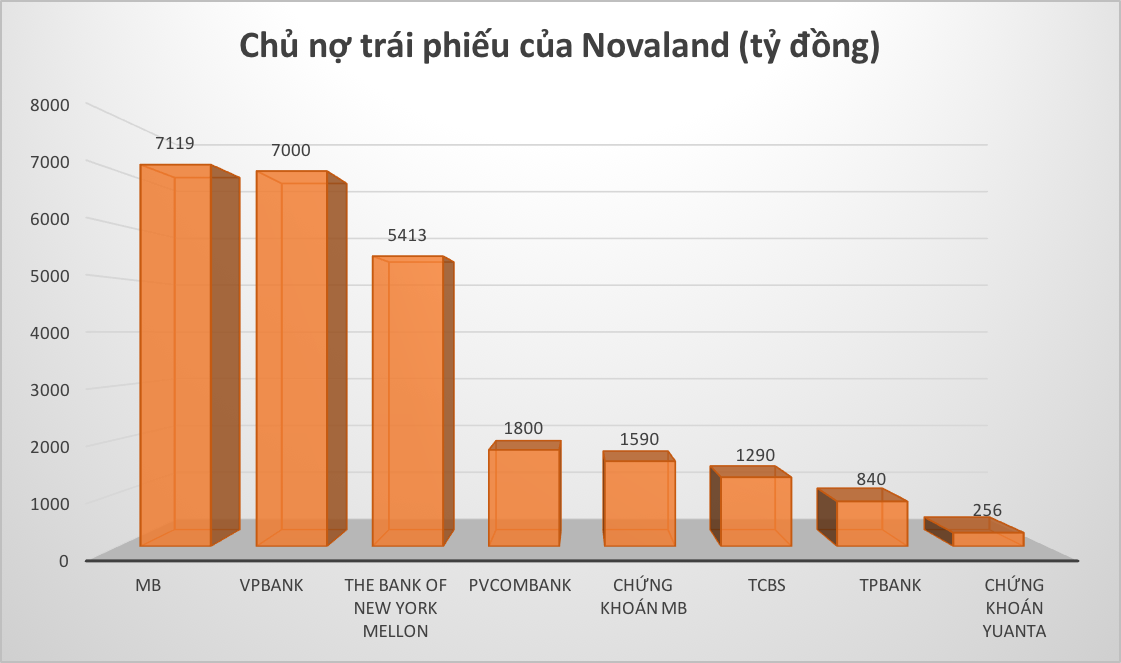 Đối với các khoản phát hành trái phiếu, trái chủ của Novaland cũng chủ yếu là các ngân hàng trong nước và quốc tế. Cụ thể, Ngân hàng Quân đội MB đang nắm nhiều nhất trái phiếu của Novaland với tổng giá trị lên đến 7.119 tỷ đồng; Ngân hàng Việt Nam Thịnh Vượng 7.000 tỷ; The Bank of New York Mellon 5.413 tỷ đồng… Các khoản trái phiếu của Novaland phát hành lãi suất dao động khoảng 10,5% - 12,5%/năm.